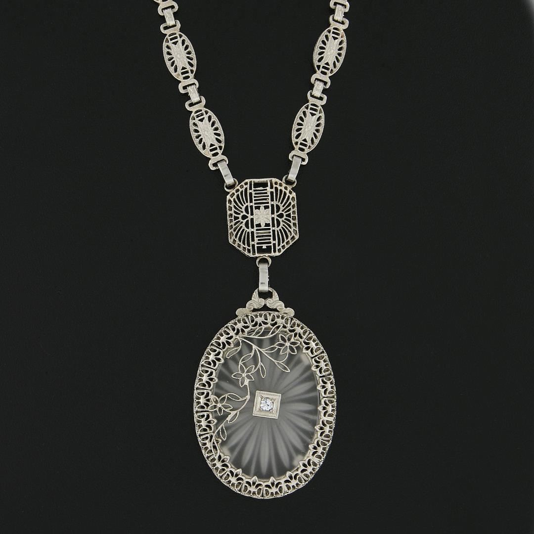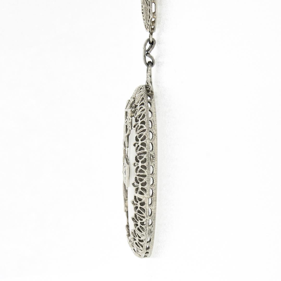 an antique solid 14k white gold dangle pendant necklace. with oval camphor glass & 1 old transitional cut natural diamond ( F - VS1 ; 0.04ct). 14 inch open filigree link chain, 9.54 grams total weight, pendant dangle measures 53.70x24mm.