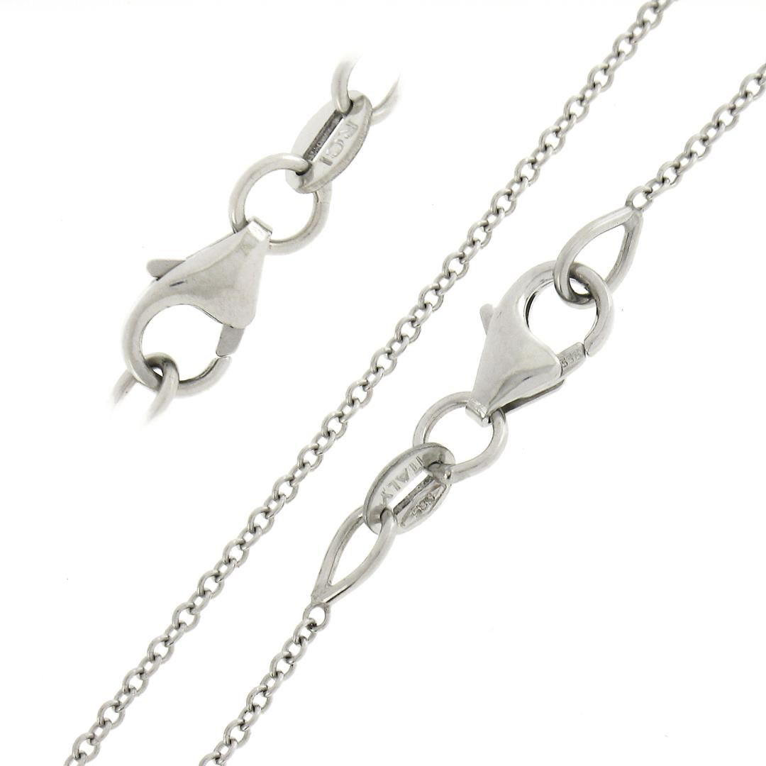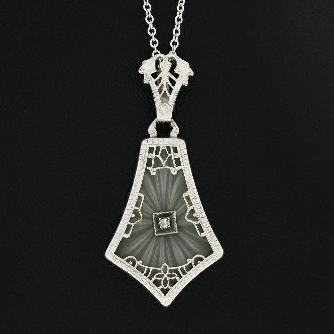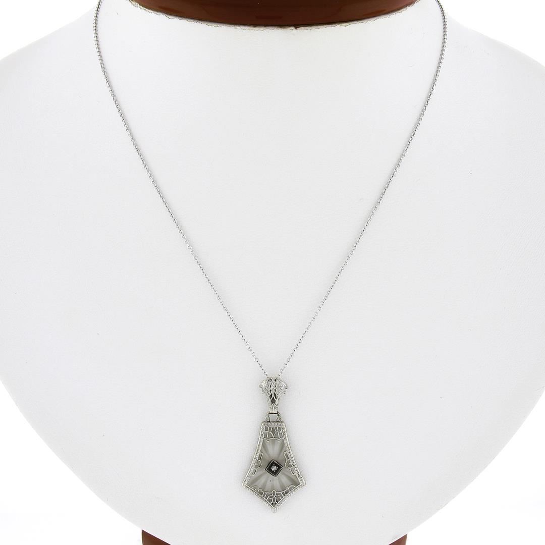 An antique solid 14k white gold pendant necklace, with 1 camphor glass, and 1 single cut natural diamond (J/K - SI1 ; 0.02ct). 18 inch cable link chain, 2.90 grams total weight, pendant measures 30x14.8mm.