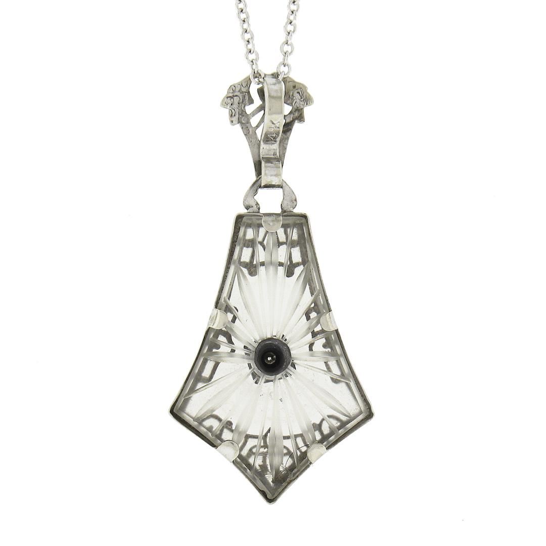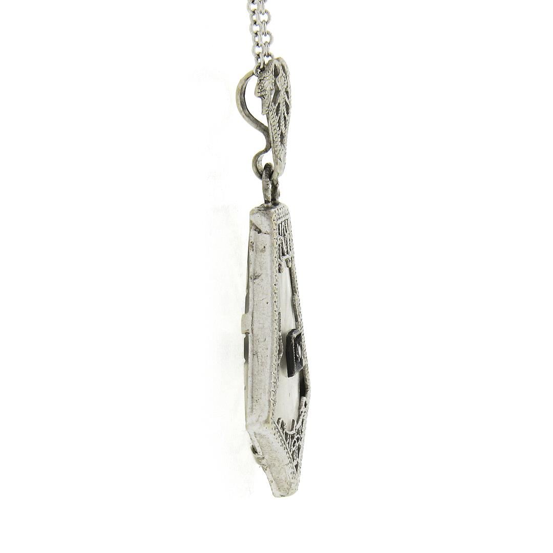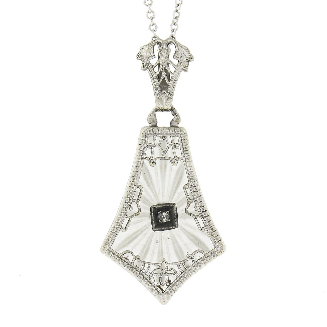 An antique solid 14k white gold pendant necklace, with 1 camphor glass, and 1 single cut natural diamond (J/K - SI1 ; 0.02ct). 18 inch cable link chain, 2.90 grams total weight, pendant measures 30x14.8mm.