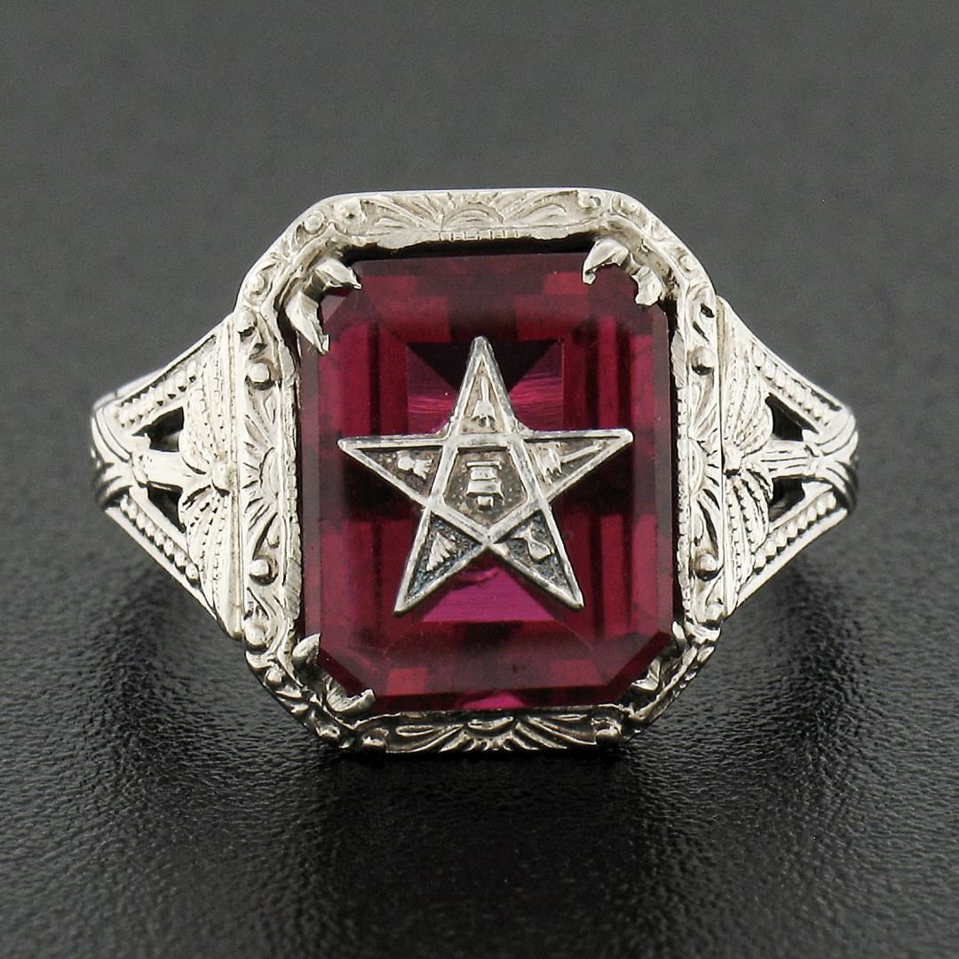 An antique solid 14k white gold ring, with 1 emerald cut red stone (10.2x8.4mm ). The ring is size 5.0, weighs a total of 3.13 grams, and measures 12.7mm wide.
