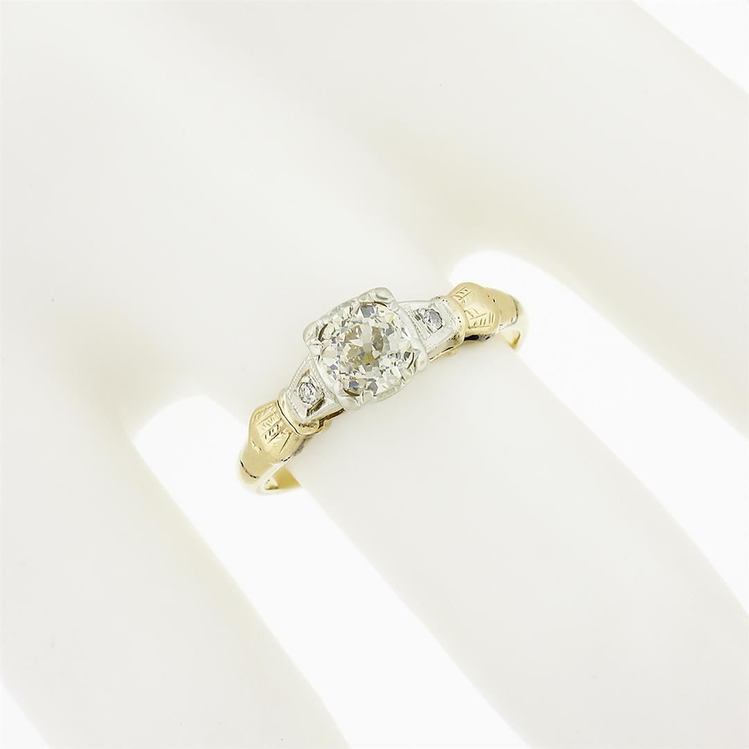An antique solid 14k yellow and white gold engagement ring, with 1 old european cut natural diamond (M/N - VS2 ; 0.50ct), accented with 2 old single cut natural diamonds (H/I - VS2 ; 0.04ctw). The ring is size 5.5, weighs a total of 1.67 grams, and measu
