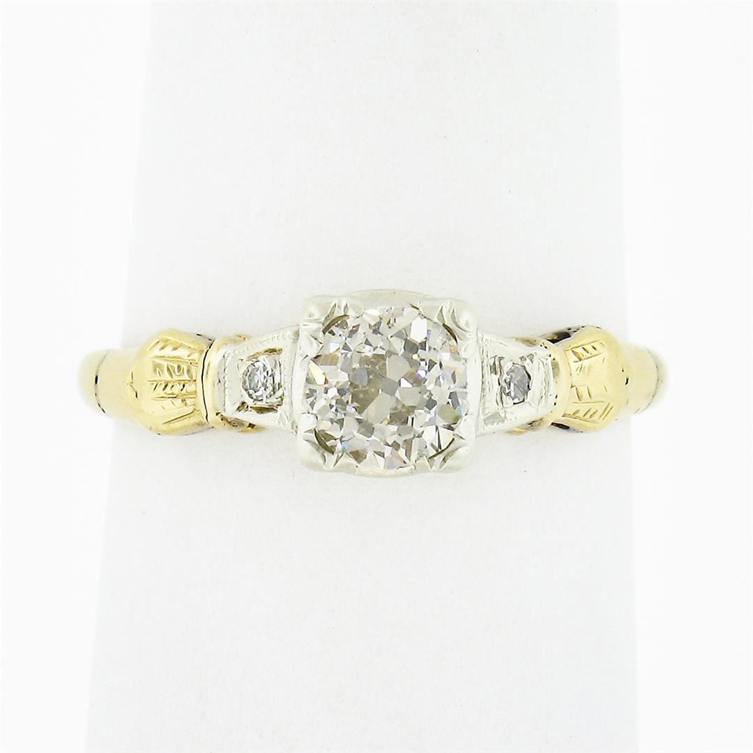 An antique solid 14k yellow and white gold engagement ring, with 1 old european cut natural diamond (M/N - VS2 ; 0.50ct), accented with 2 old single cut natural diamonds (H/I - VS2 ; 0.04ctw). The ring is size 5.5, weighs a total of 1.67 grams, and measures 5.65mm wide.
