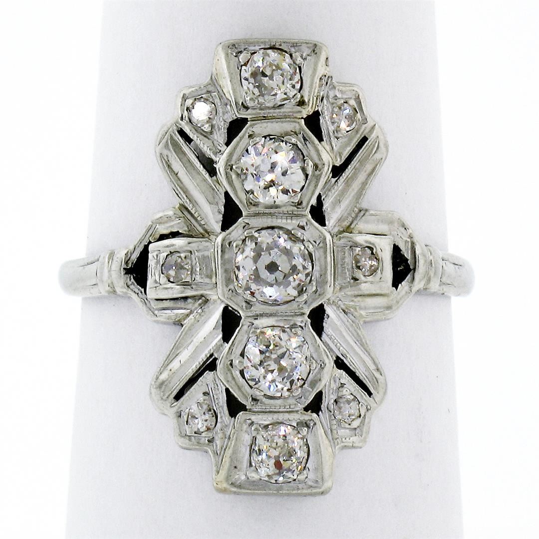 An antique soldi 14k white gold milgrain dinner ring, with 6 round single cut natural diamonds (G/H- VS2/SI1; 0.10ctw ), and 5 old european cut natural diamonds (G/H-VS1/VS2; 0.50ctw ). The ring is size 6.0, weighs a total of 2.69 grams, and measures 19.70mm wide.