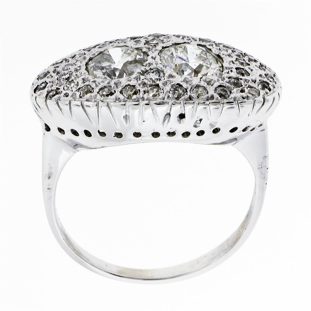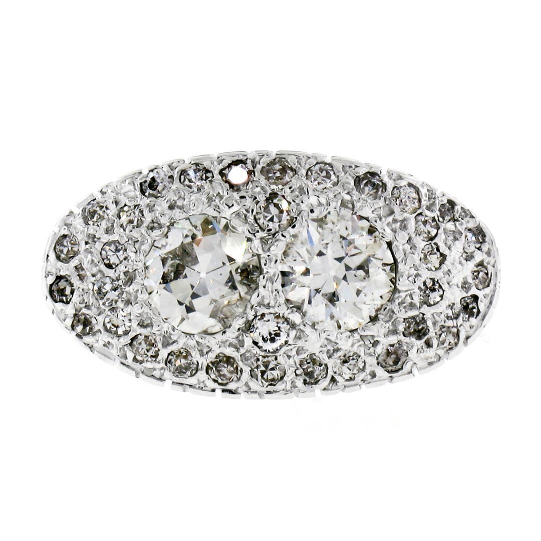 An antique soldi 14k white gold cluster ring, with 1 old european cut natural diamond (I/J- VS2 ; 0.55ct), and 1 old european cut natural diamond (I/J-SI2; 0.55ct), with 33 round single cut natural diamonds (H/I- VS1/VS2; 0.35ctw). The ring is size 6.0, weighs a total of 5.81 grams, and measures 11.15mm wide.