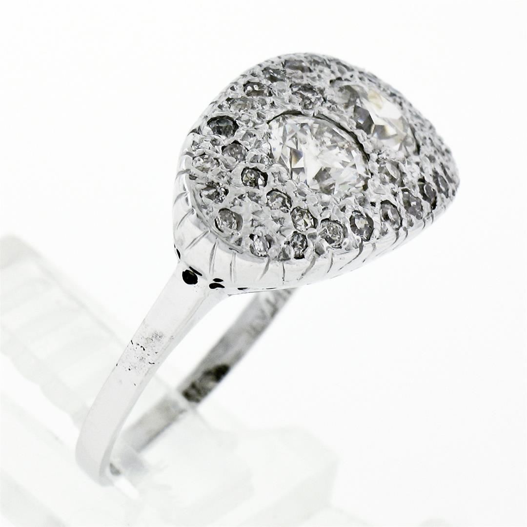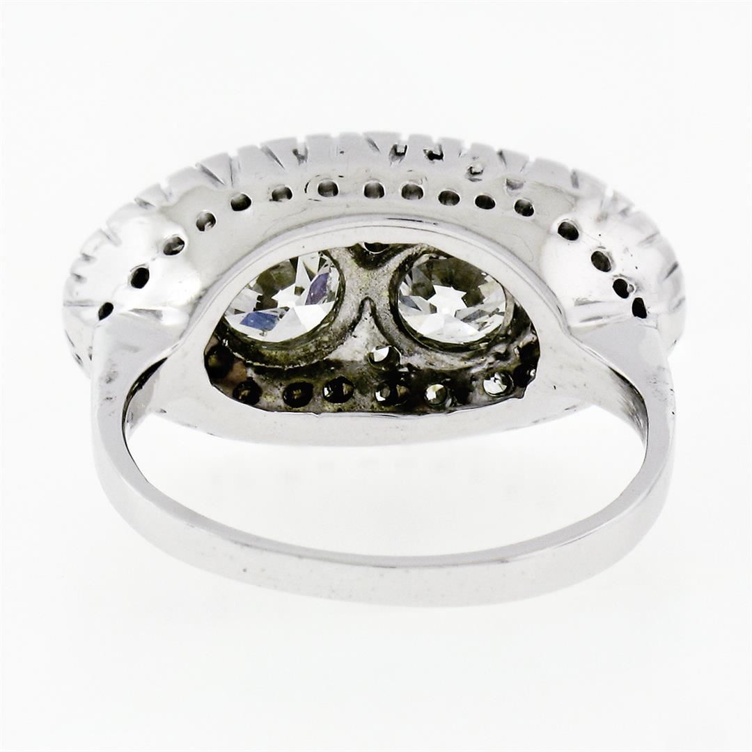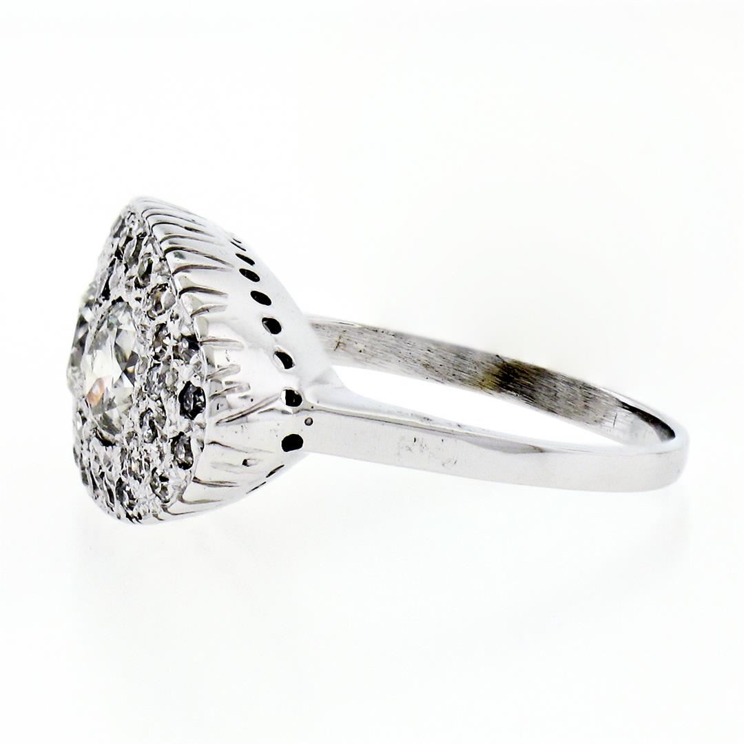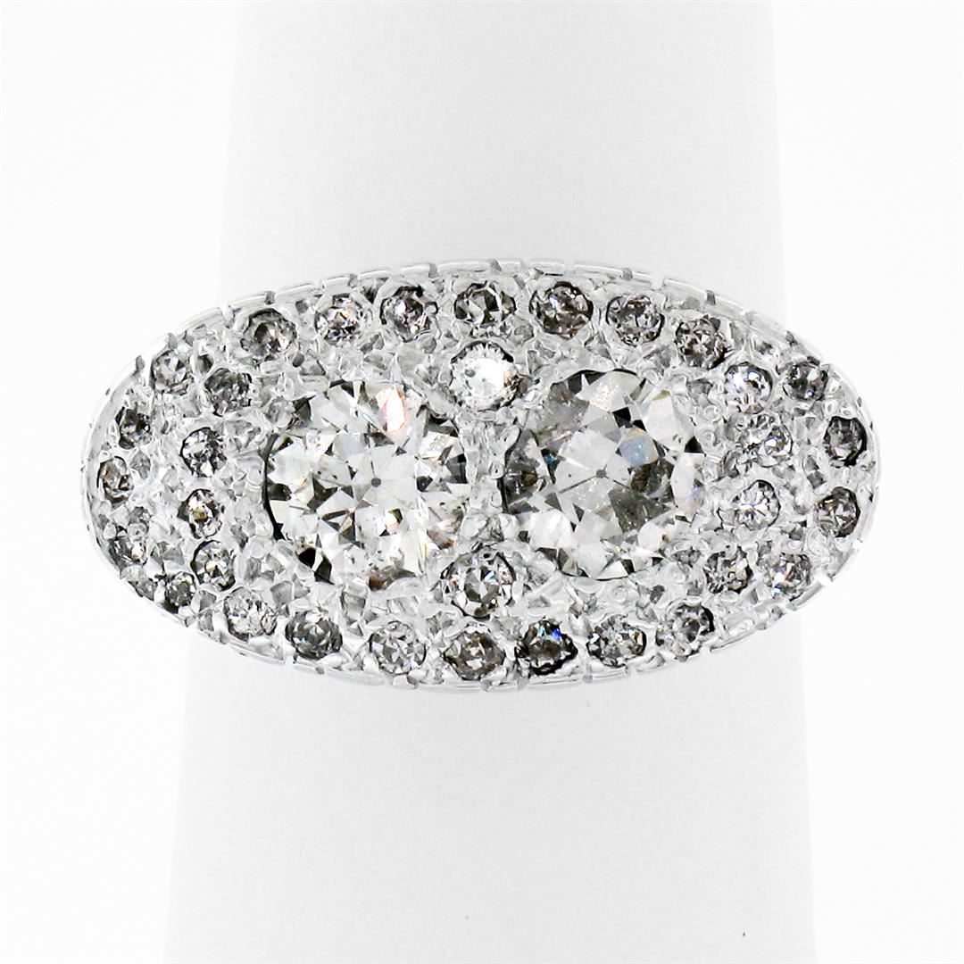 An antique soldi 14k white gold cluster ring, with 1 old european cut natural diamond (I/J- VS2 ; 0.55ct), and 1 old european cut natural diamond (I/J-SI2; 0.55ct), with 33 round single cut natural diamonds (H/I- VS1/VS2; 0.35ctw). The ring is size 6.0, weighs a total of 5.81 grams, and measures 11.15mm wide.