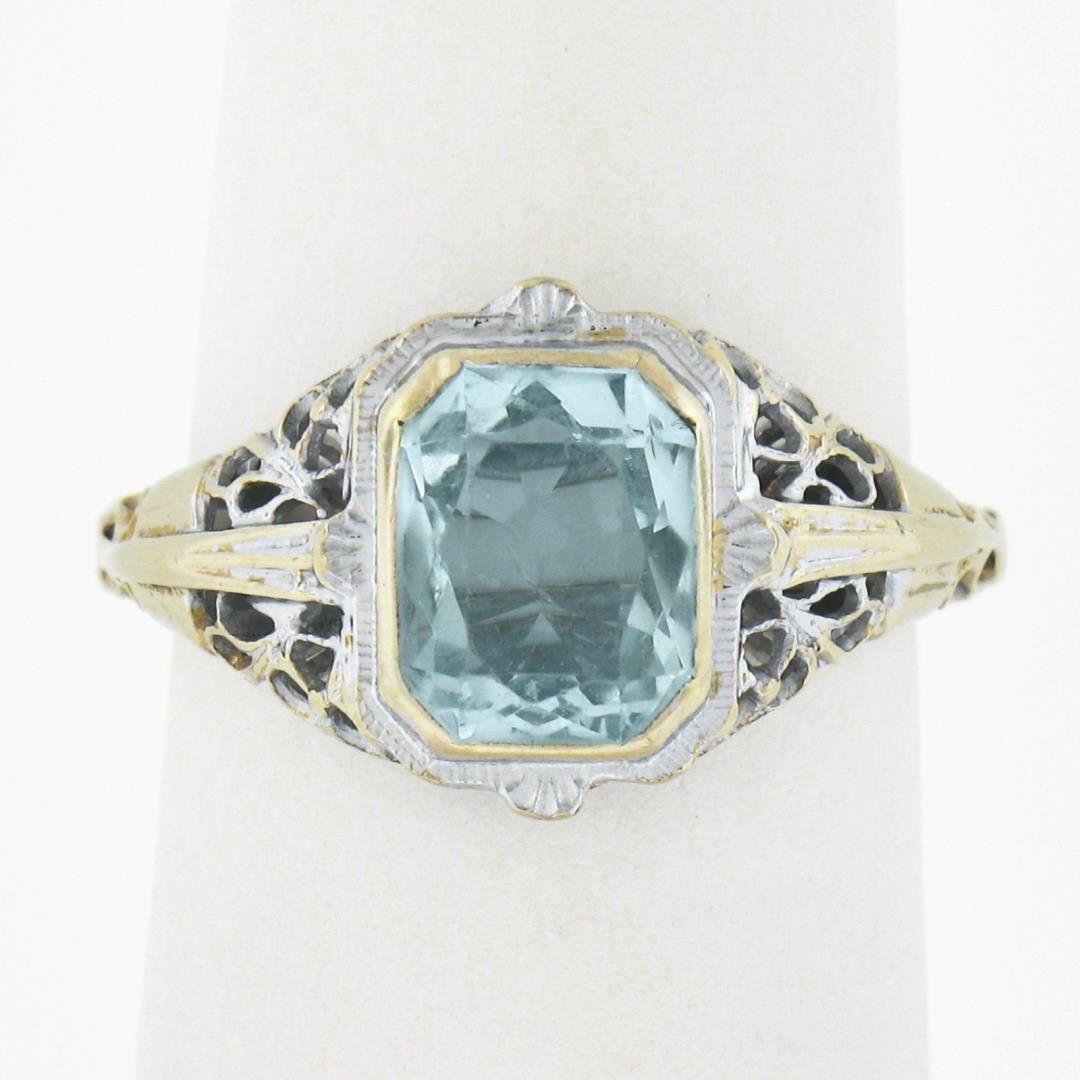 An antique solid 14k white gold ring, with 1 rectangular cut natural aquamarine (1.50ct ). The ring is size 5.5, weighs a total of 2.47 grams, and measures 11.5mm wide.