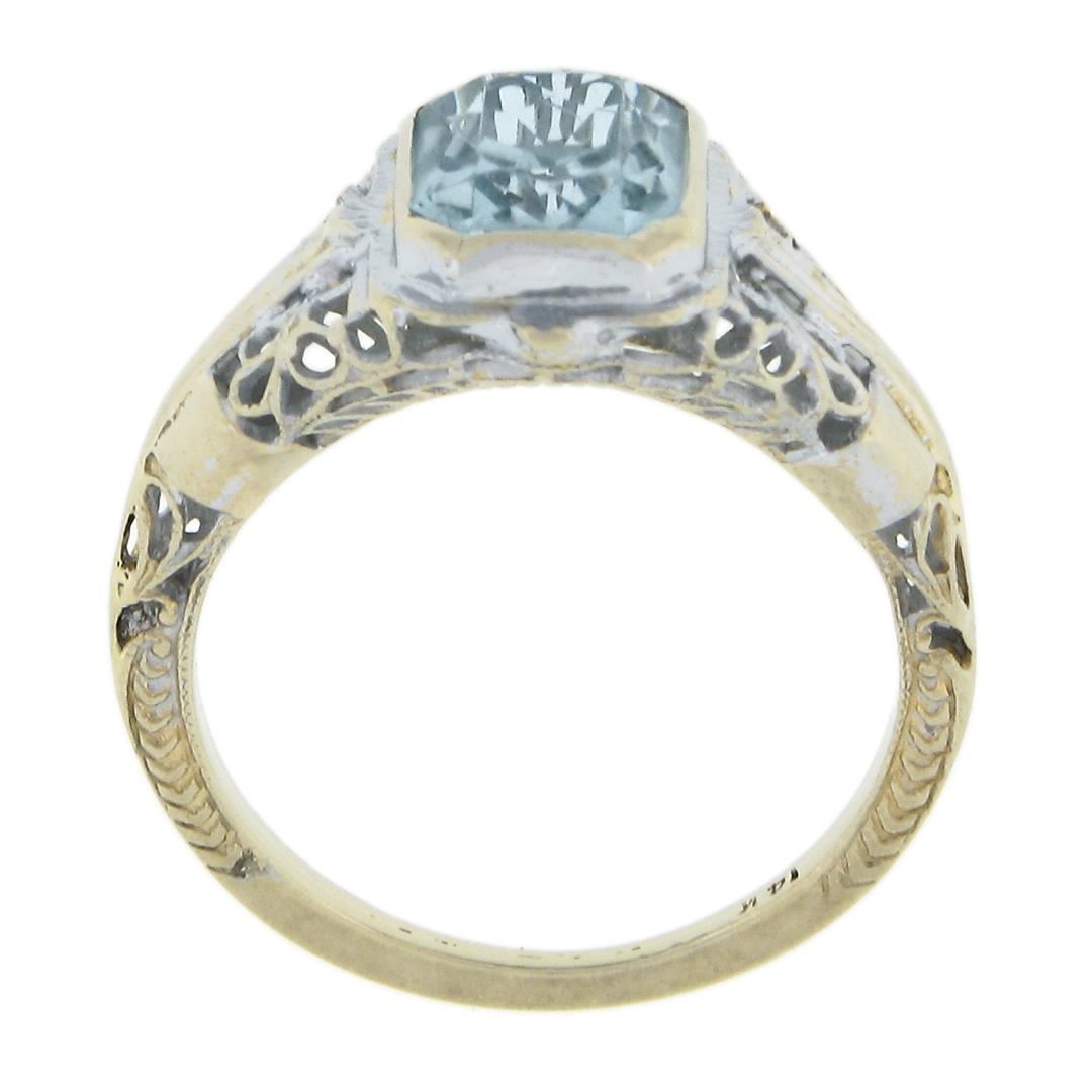 An antique solid 14k white gold ring, with 1 rectangular cut natural aquamarine (1.50ct ). The ring is size 5.5, weighs a total of 2.47 grams, and measures 11.5mm wide.