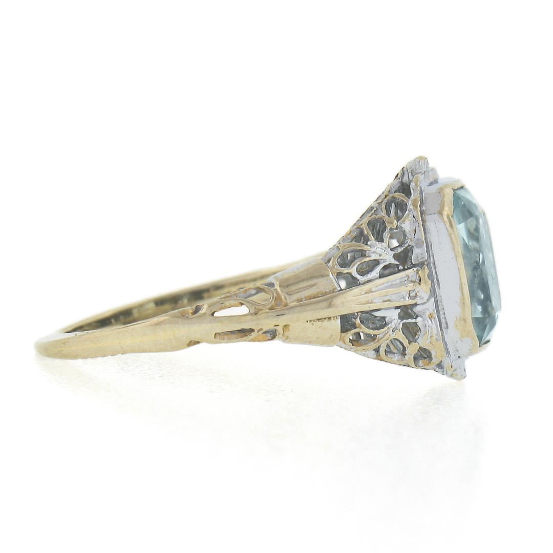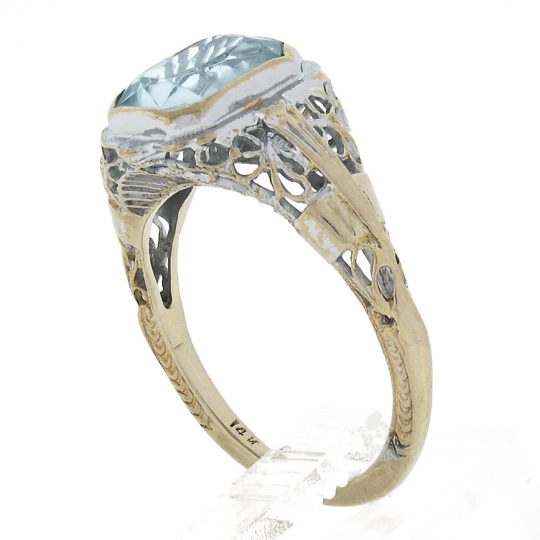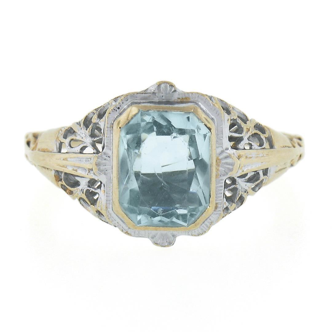 An antique solid 14k white gold ring, with 1 rectangular cut natural aquamarine (1.50ct ). The ring is size 5.5, weighs a total of 2.47 grams, and measures 11.5mm wide.