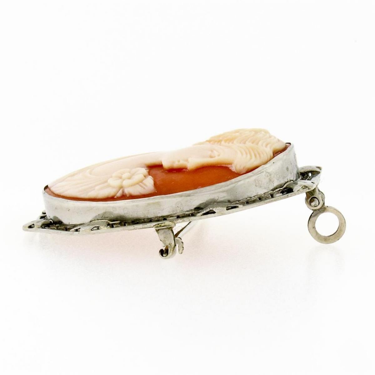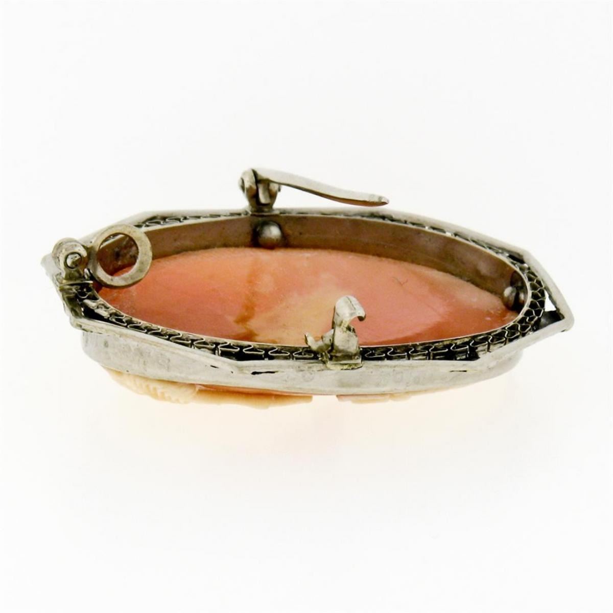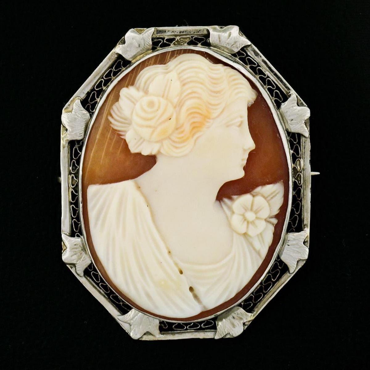 Antique Art Deco 14K White Gold Carved Shell Cameo Open Filigree Brooch Pendant. An art deco period solid 14k white gold brooch or pendant featuring a carved natural shell cameo (29.15x22.55mm) surrounded by an open filigree work frame. Measures 38.60x27.