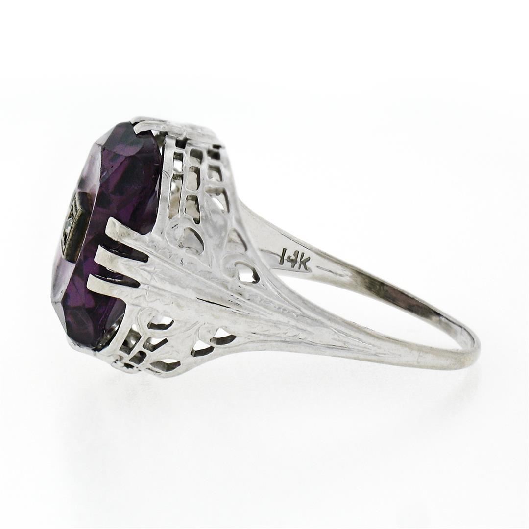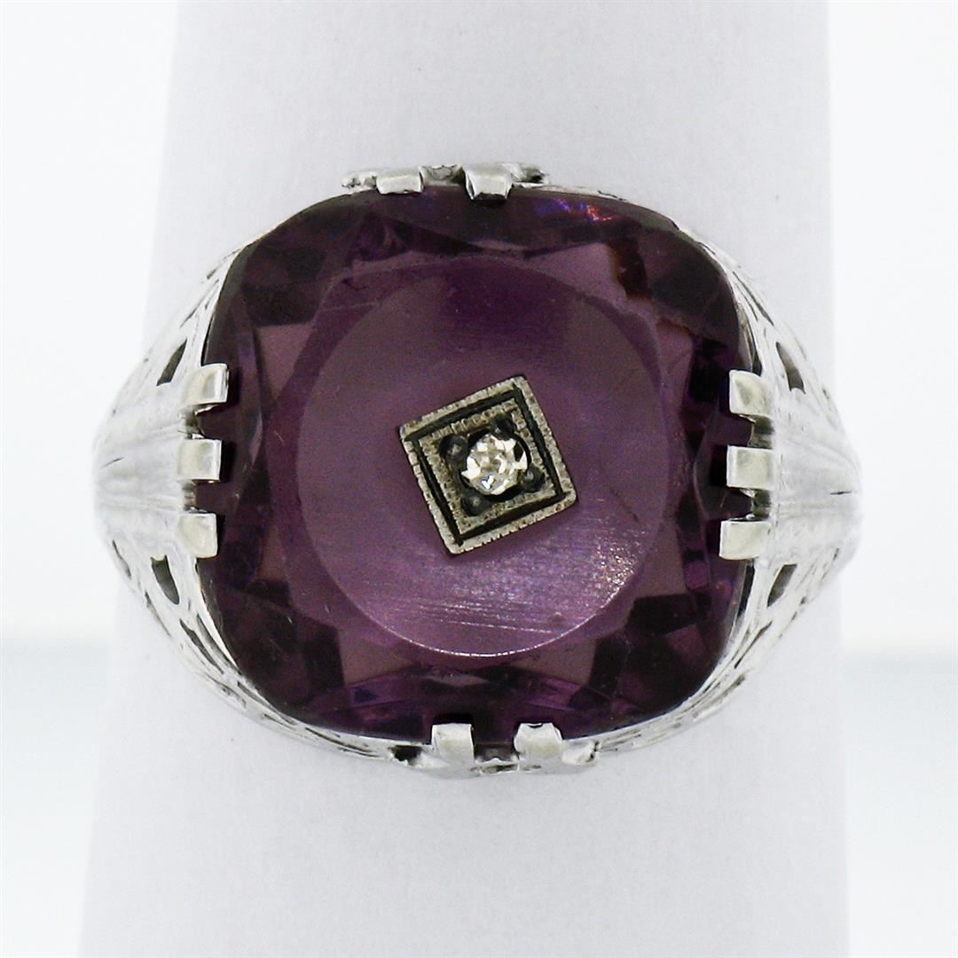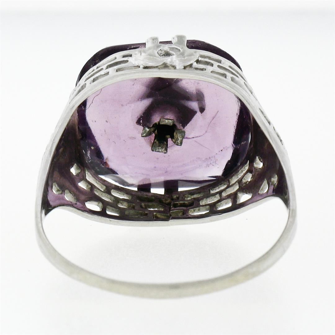 An antique solid 14k white gold filigree ring, with 1 custom cut natural amethyst (13.0x13.0mm), and 1 old single cut natural diamond (H - VS2 ; 0.02ct). The ring is size 7.5, weighs a total of 3.77 grams, and measures 14.65mm wide.