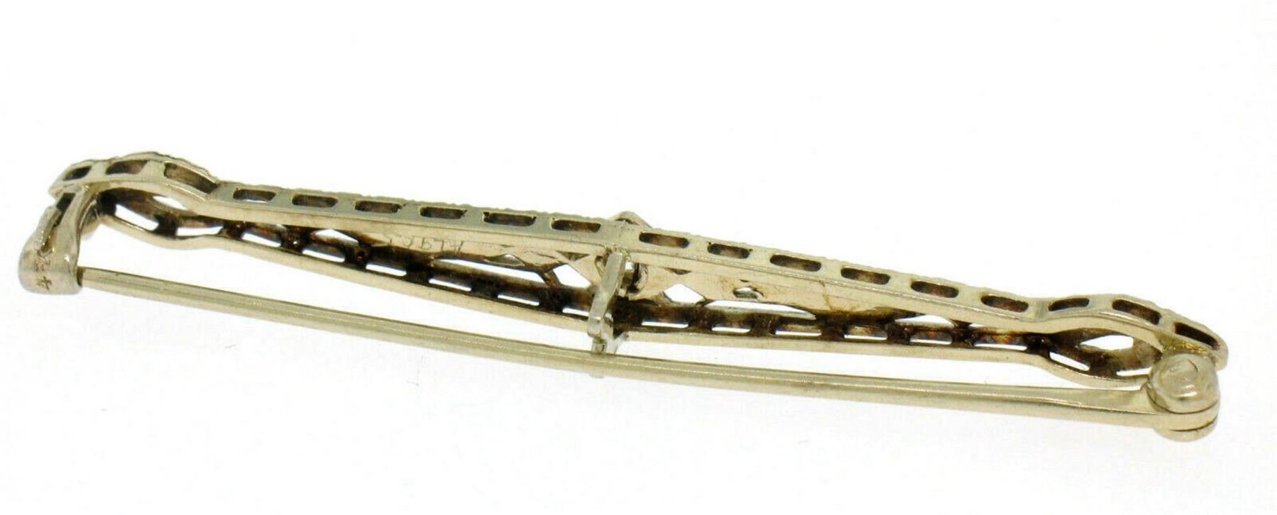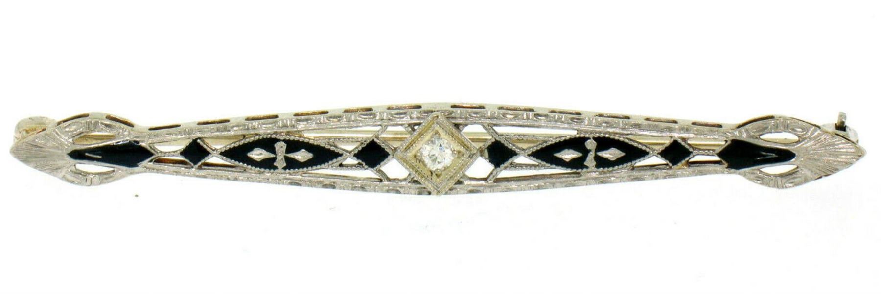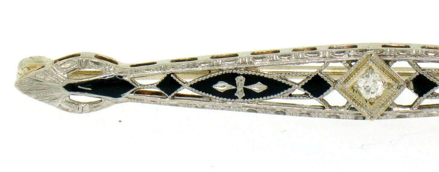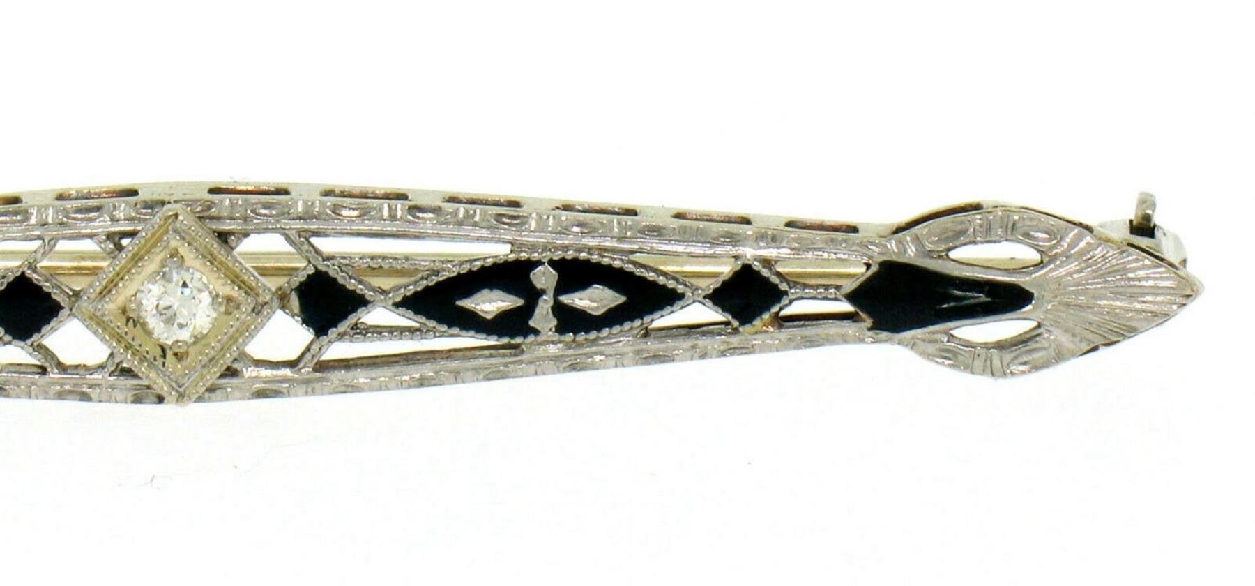 One Antique Art Deco 14k Solid White Gold Black Enamel filigree and diamond bar pin brooch. Weighs 3.0 Grams. It measures 5.66mm wide and 52.56mm long. The Old European Diamond weighs approx. .04ct and has F color and VS1 Clarity.