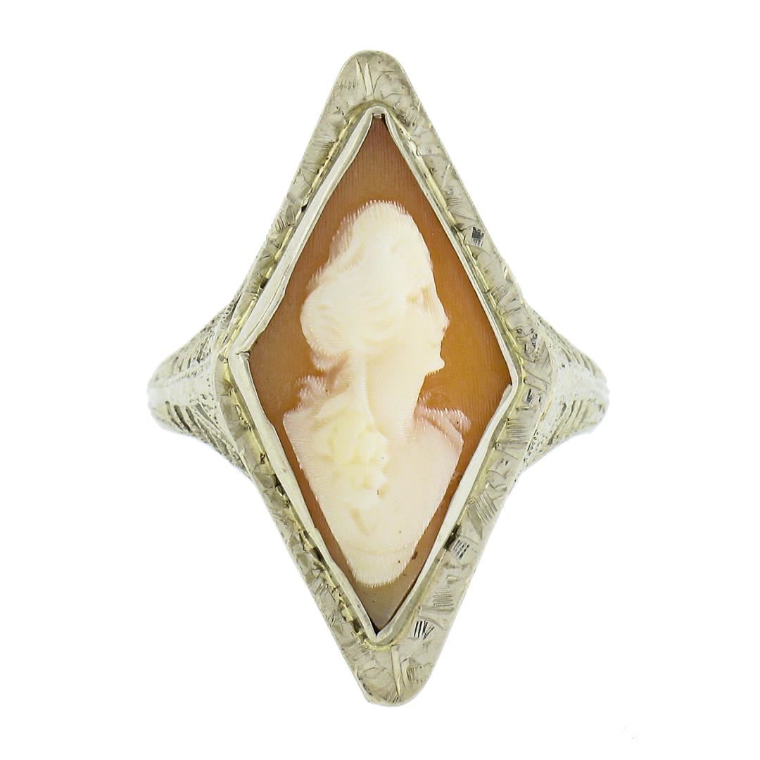 An antique solid 14k white gold ring, with 1 carved shell cameo (18.8x9.8mm). The ring is size 5.0, weighs a total of 3.0 grams, and measures 24mm wide.