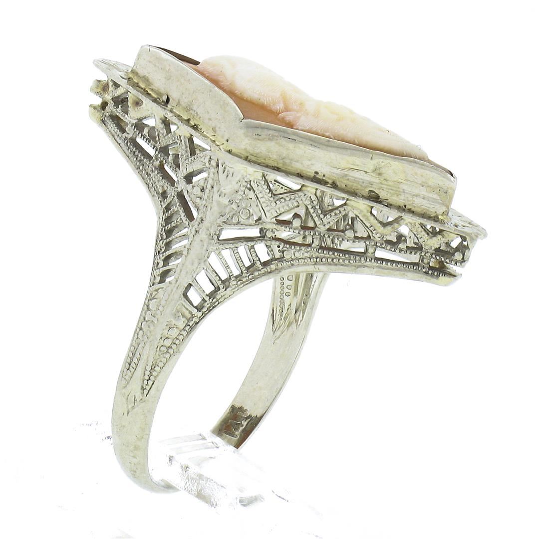 An antique solid 14k white gold ring, with 1 carved shell cameo (18.8x9.8mm). The ring is size 5.0, weighs a total of 3.0 grams, and measures 24mm wide.