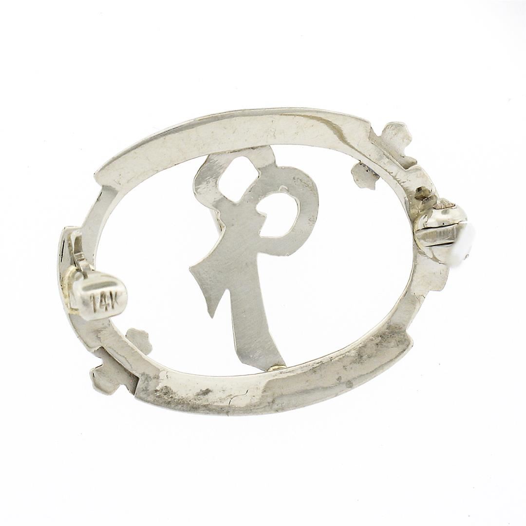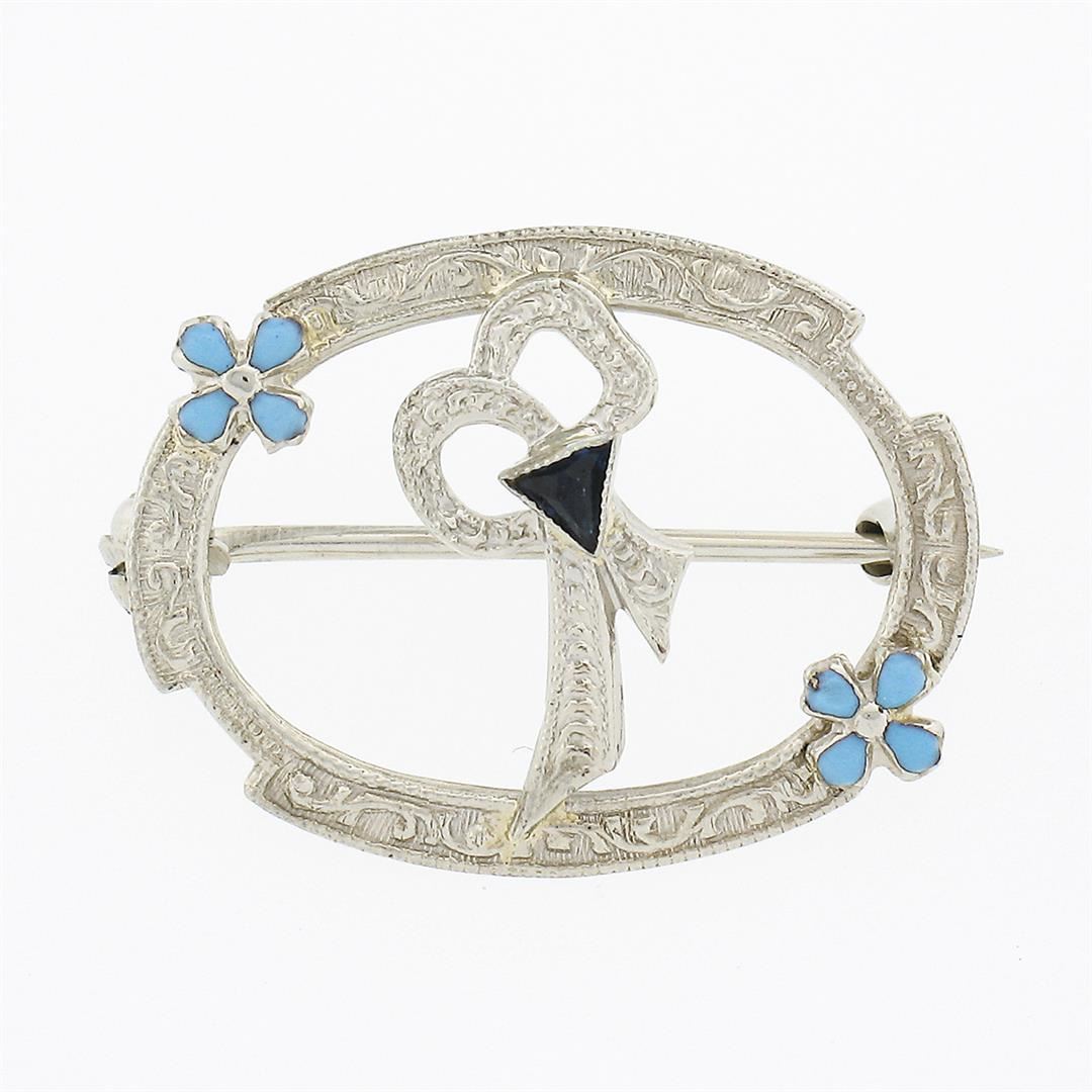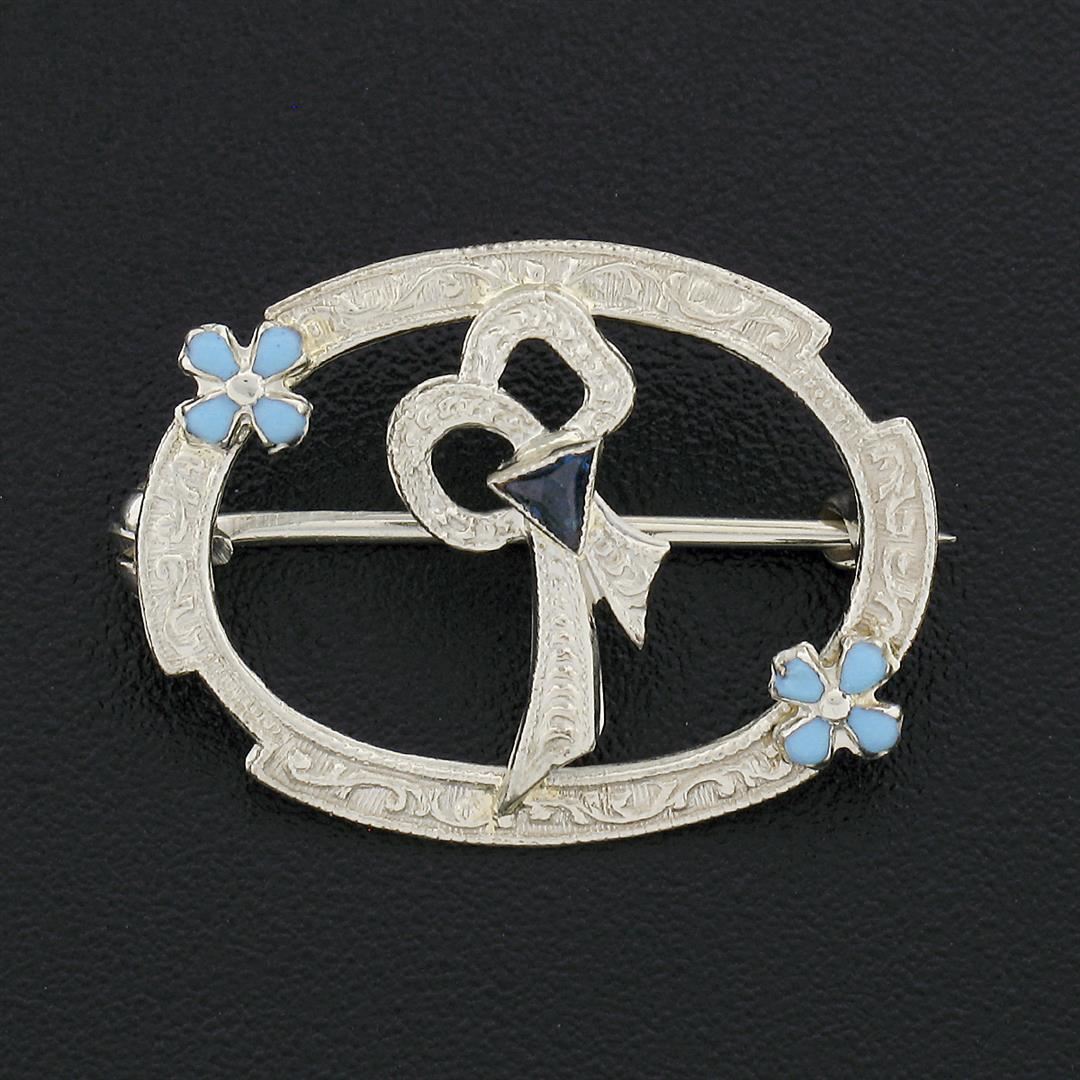 An antique solid 14k white gold brooch, with enamel work & 1 triangle cut synthetic sapphire (2.5x2.5mm). Measures 15.70x20.50mm and weighs a total of 1.29 grams.
