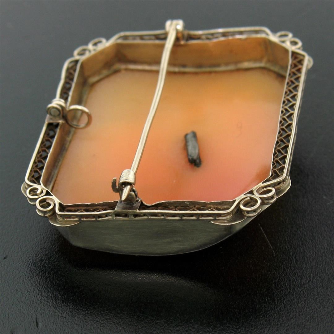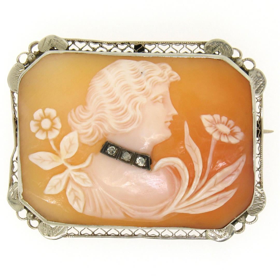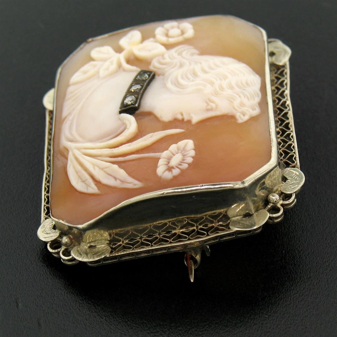 Antique Art Deco 14K White Gold Shell Cameo w/ Filigree Frame Brooch Pendant. Please see photos and description for all available information. An antique art deco solid 14k white gold brooch or pendant, with 1 rextangular shape carved natural shell cameo (41x30mm), and 3 round single cut natural diamonds (H- VS1; 0.06ctw). Measures 35.18x45.53mm and weighs a total of 11.0 grams.