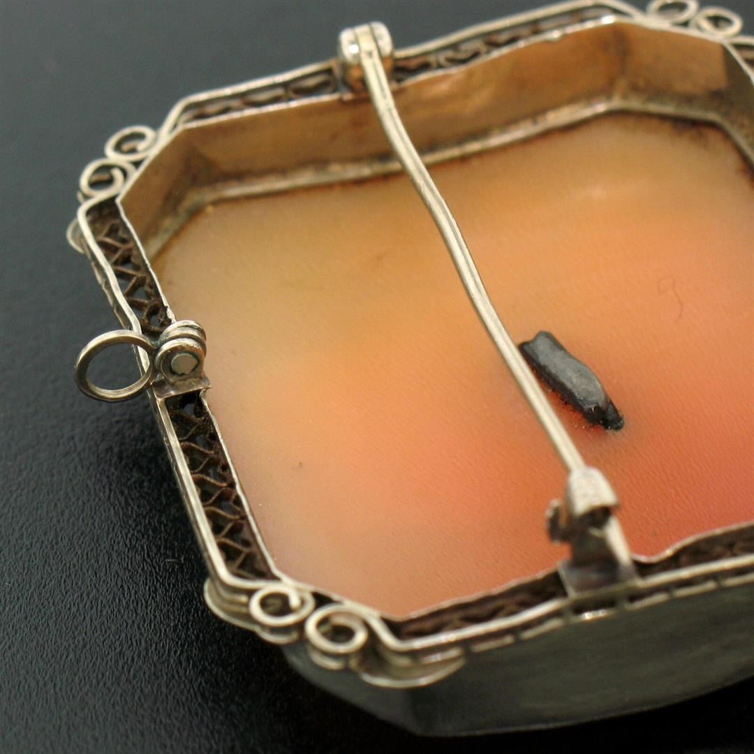 Antique Art Deco 14K White Gold Shell Cameo w/ Filigree Frame Brooch Pendant. Please see photos and description for all available information. An antique art deco solid 14k white gold brooch or pendant, with 1 rextangular shape carved natural shell cameo (41x30mm), and 3 round single cut natural diamonds (H- VS1; 0.06ctw). Measures 35.18x45.53mm and weighs a total of 11.0 grams.
