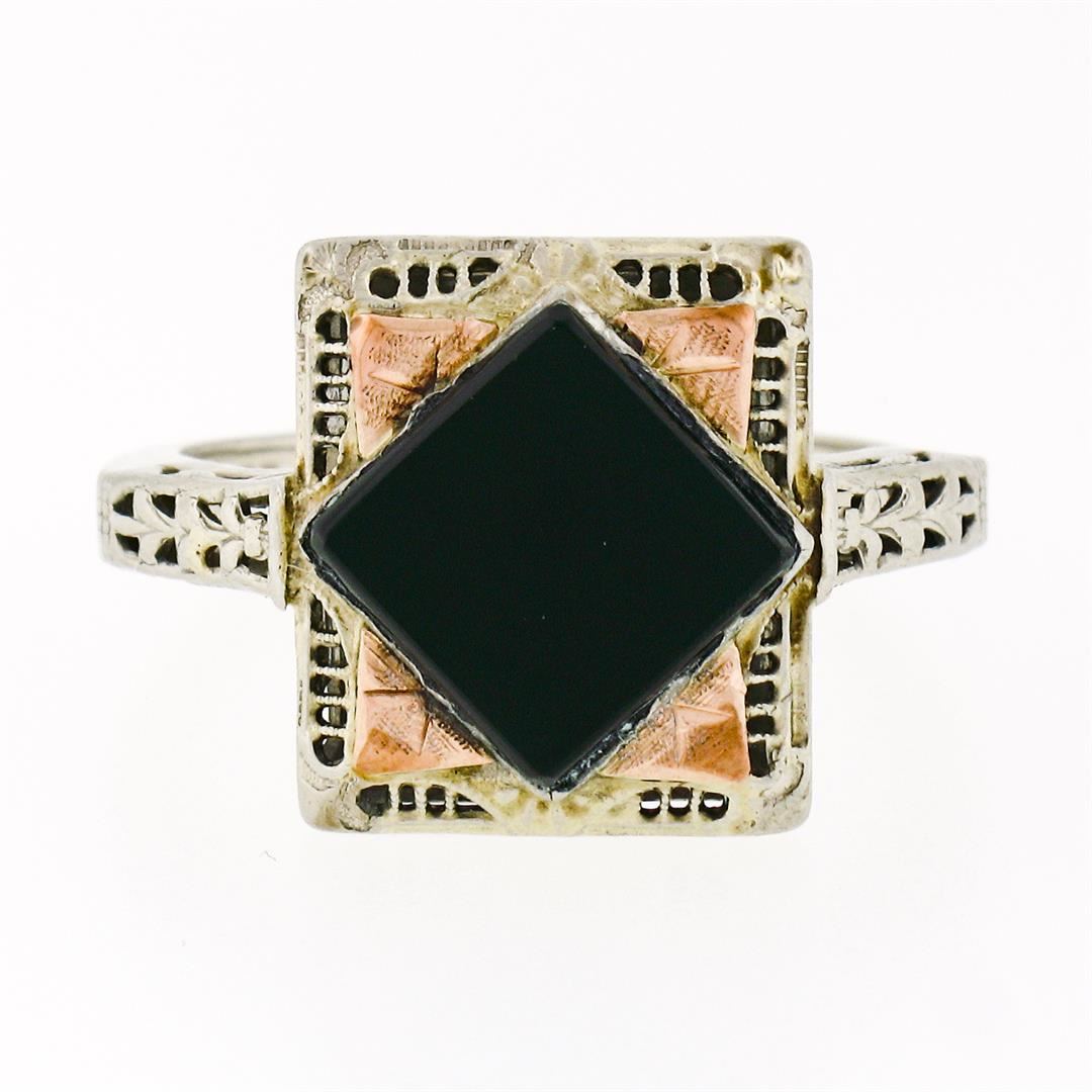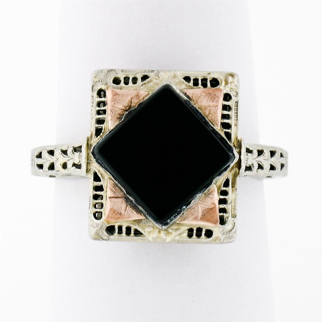 An antique solid 14k white and rose gold filigree ring, with 1 square shape natural onyx (8.3mm). The ring is size 7.0, weighs a total of 4.05 grams, and measures 13.8mm wide.