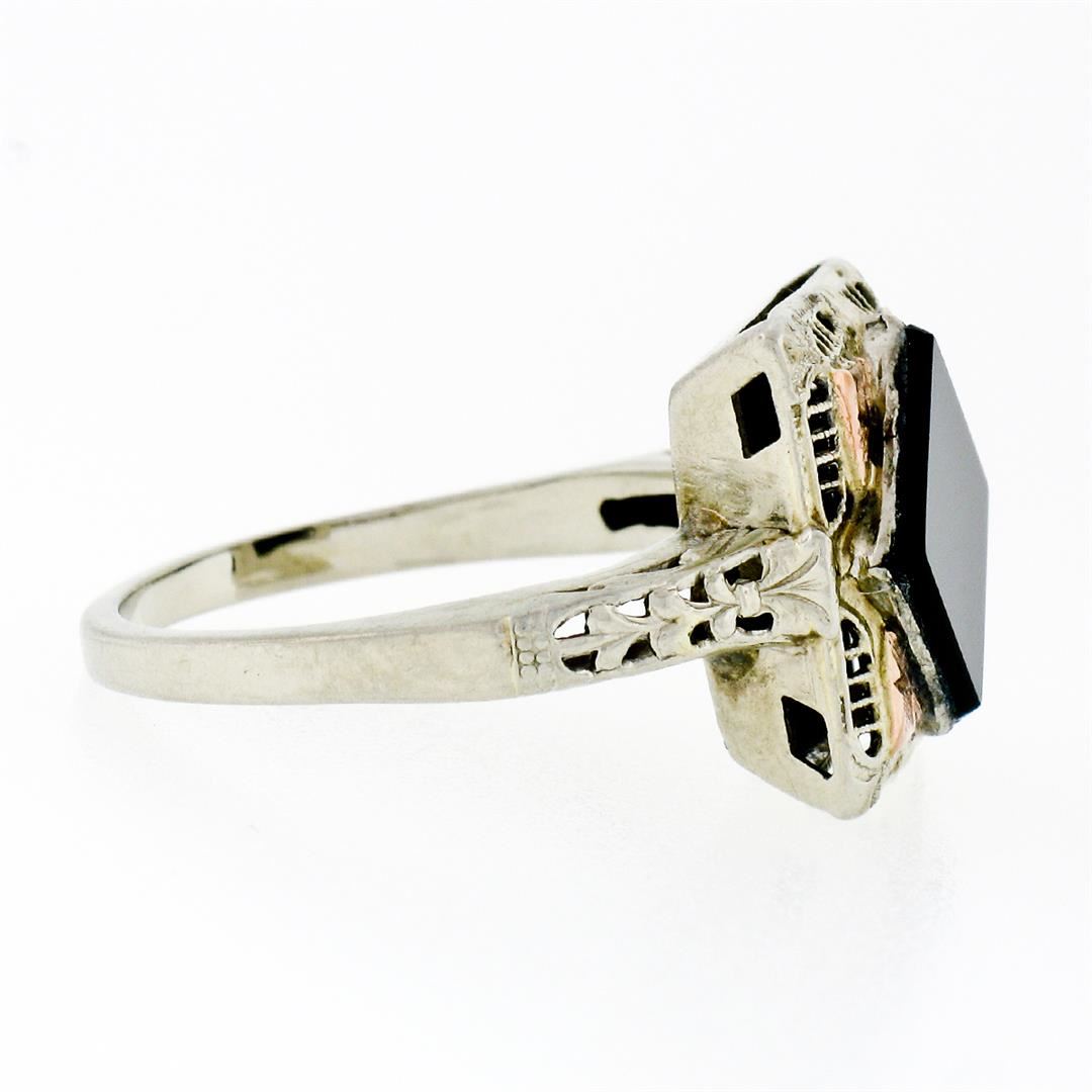 An antique solid 14k white and rose gold filigree ring, with 1 square shape natural onyx (8.3mm). The ring is size 7.0, weighs a total of 4.05 grams, and measures 13.8mm wide.