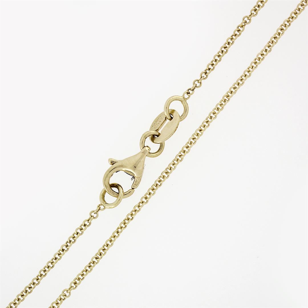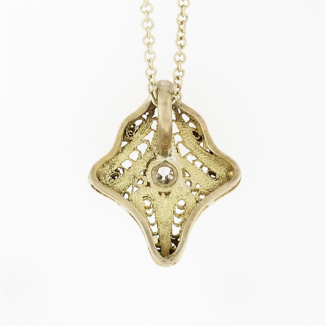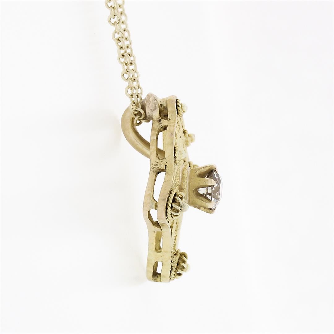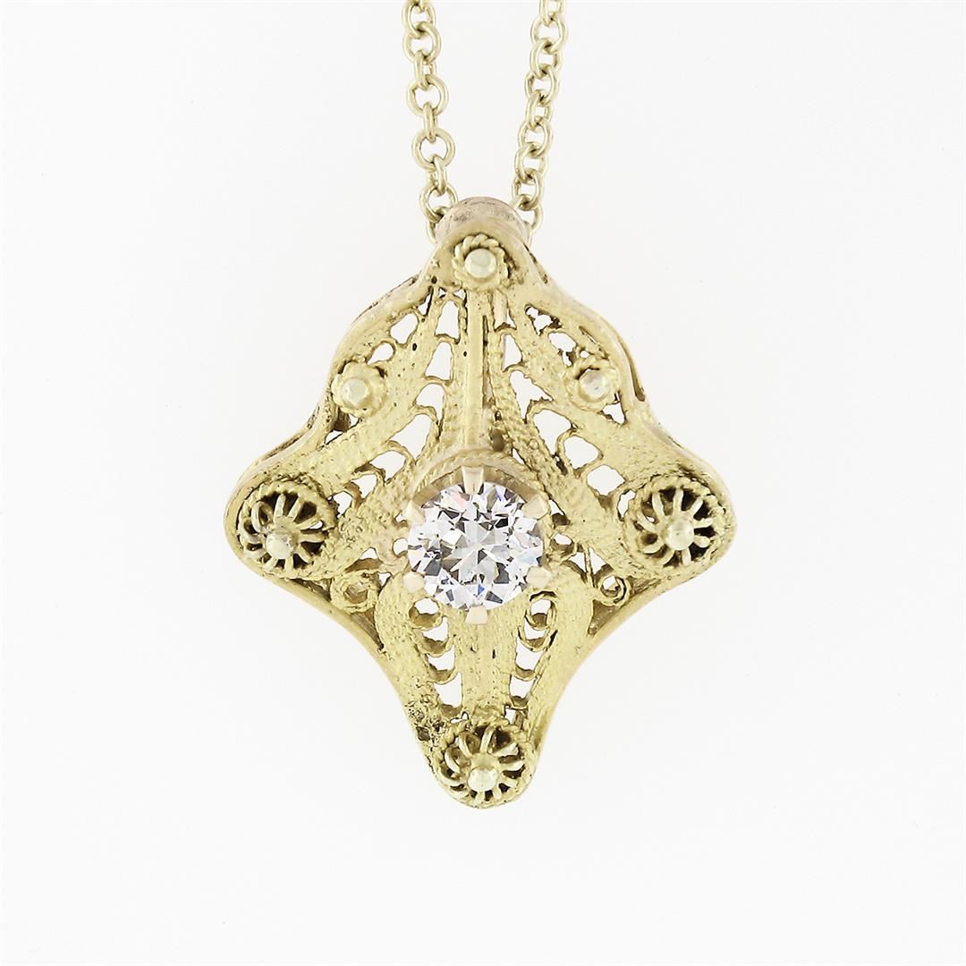 An antique art deco solid 14k yellow gold pendant necklace, featuring 1 old european cut natural diamond (F - VS2 ; 0.16ct). 18 inch cable link chain, 3.0 grams total weight, pendant measures 16x13.35mm.