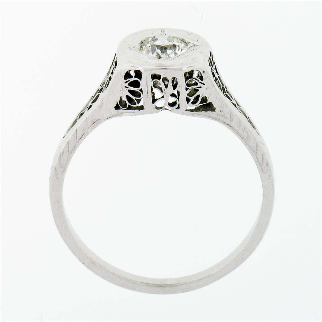 An antique soldi 14k white gold solitaire ring, with 1 old european cut natural diamond (I/J- VS2 ; 0.36ct ). The ring is size 7.5, weighs a total of 2.61 grams, and measures 7.90mm wide.