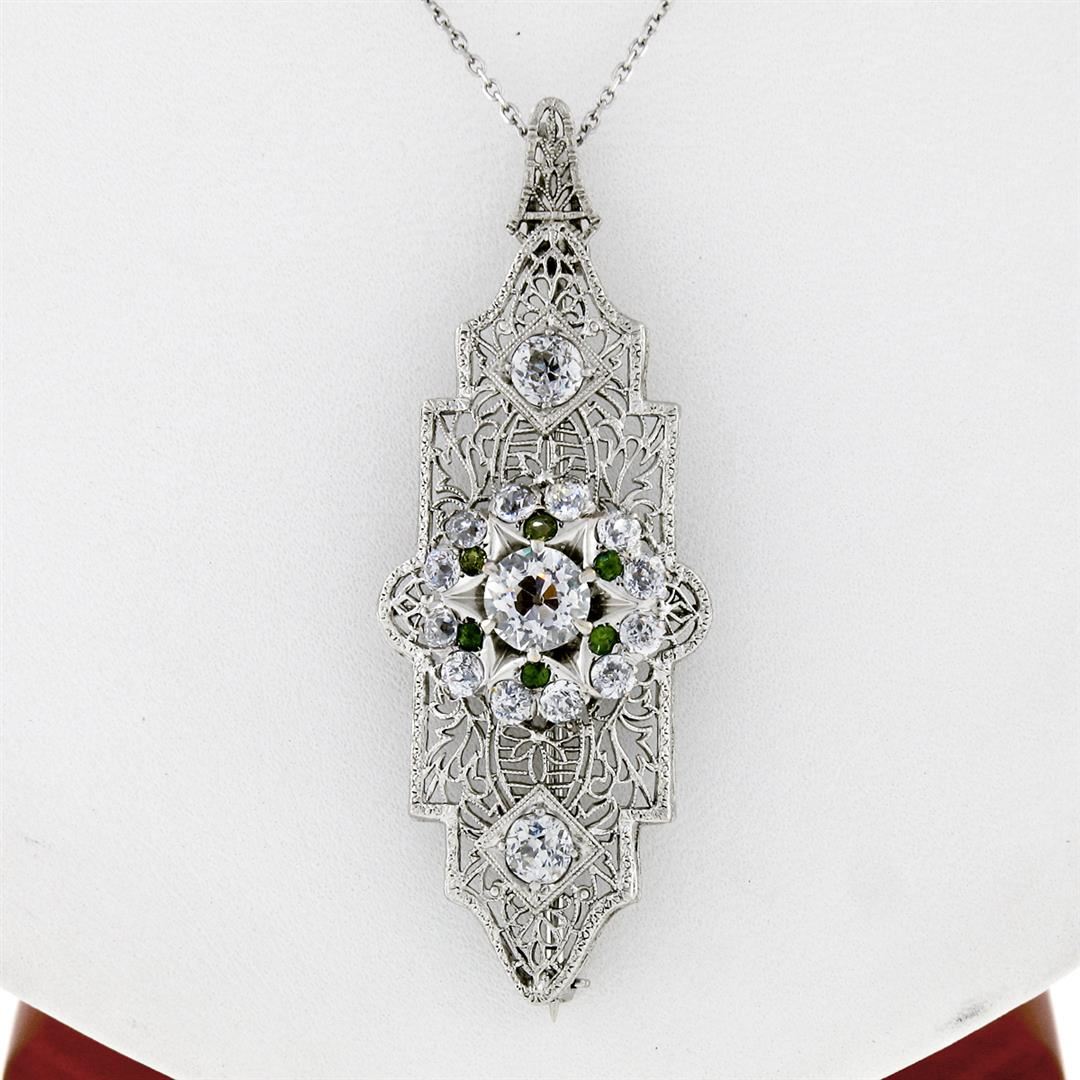 An antique solid 14k white gold brooch pendant necklace, with 15 old cut natural diamonds (H/I - VS1/VS2; 2.64ctw), and 5 old round cut natural demantoid garnets (0.15ctw ). The pendant weighs a total of 8.59 grams, measures 53x19.45mm including the bail, with 22 inch cable link chain.