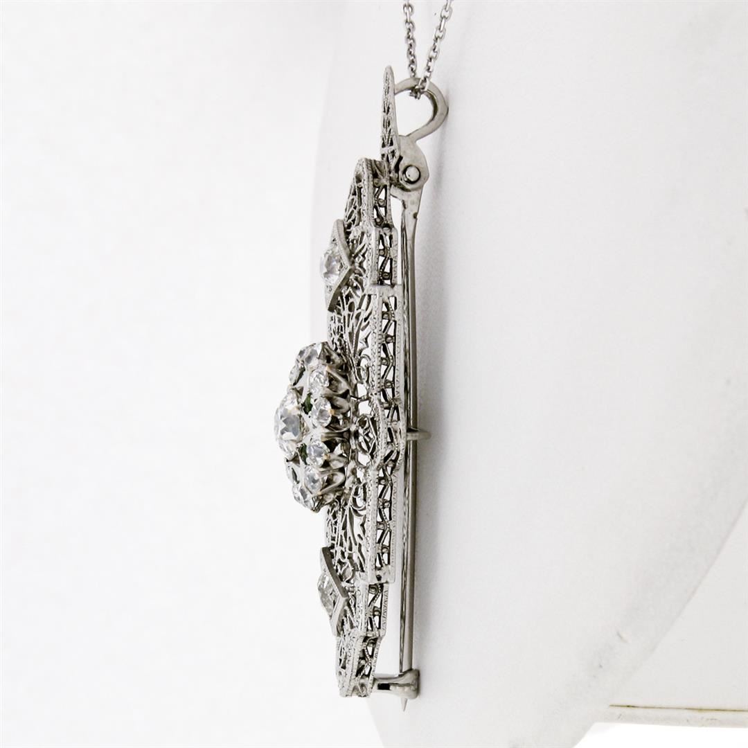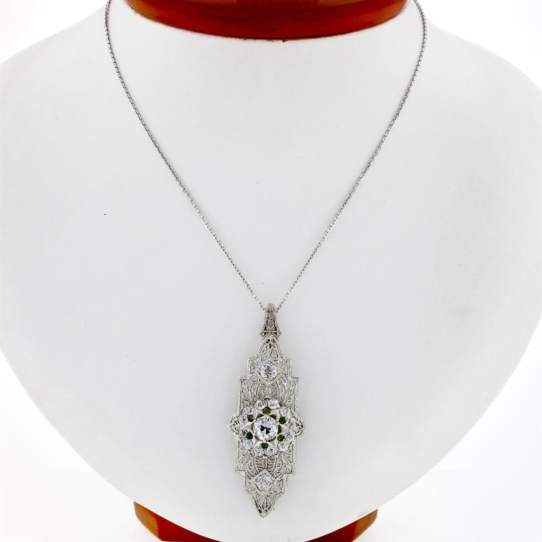 An antique solid 14k white gold brooch pendant necklace, with 15 old cut natural diamonds (H/I - VS1/VS2; 2.64ctw), and 5 old round cut natural demantoid garnets (0.15ctw ). The pendant weighs a total of 8.59 grams, measures 53x19.45mm including the bail, with 22 inch cable link chain.