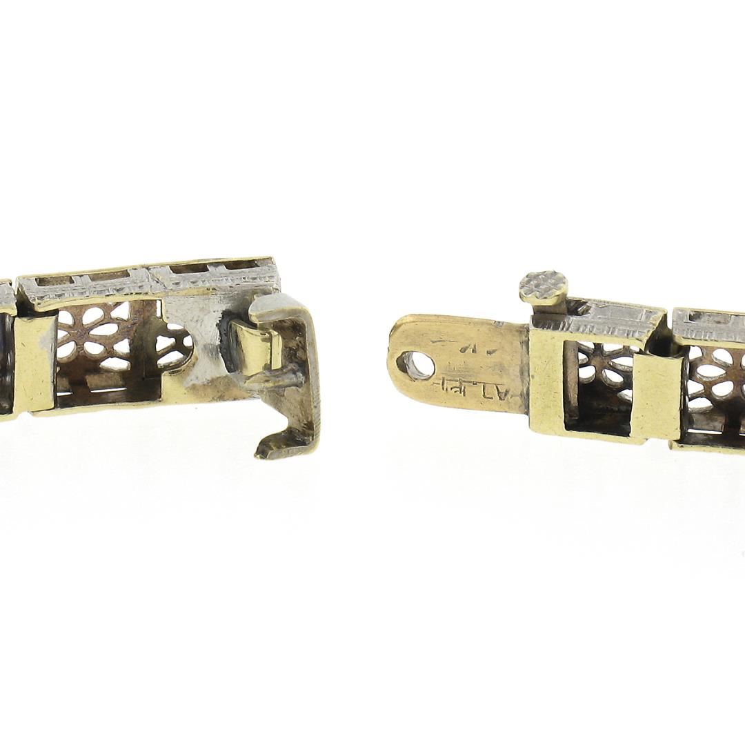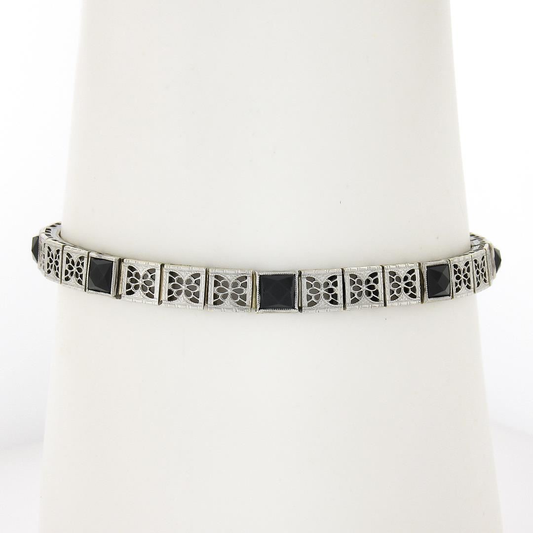 An antique solid 14k white gold belly bracelet, with 5 square french cut natural black onyx (4x4mm each). It weighs a total of 10.88 grams, measures 5.20mm wide, and measures 6.5 inches in length.