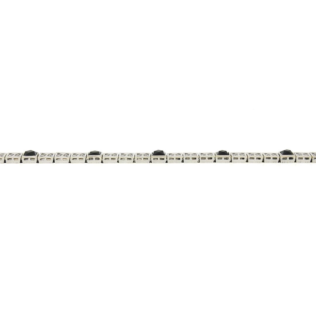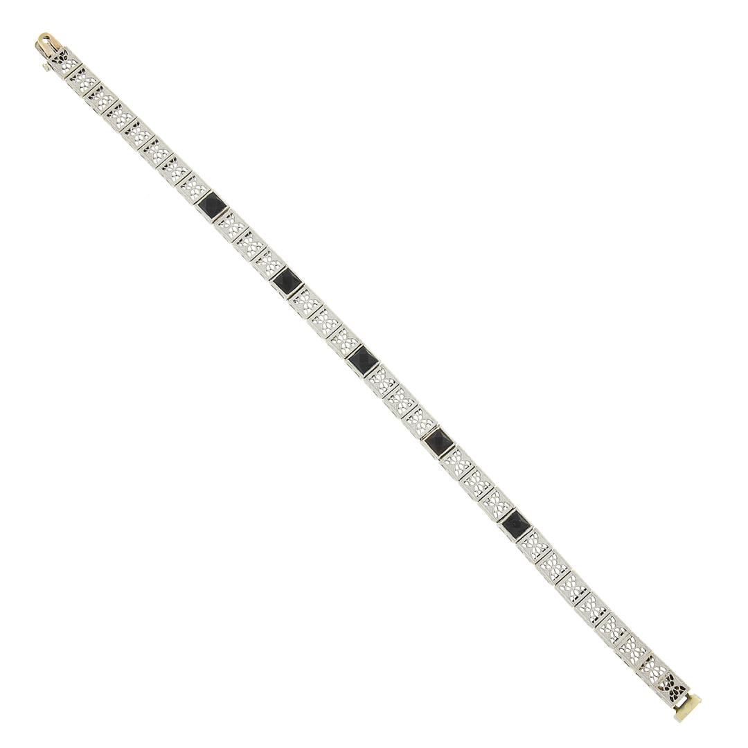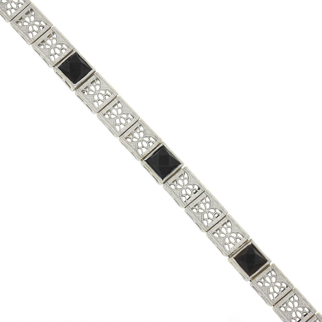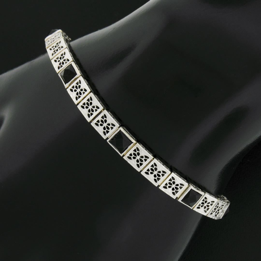 An antique solid 14k white gold belly bracelet, with 5 square french cut natural black onyx (4x4mm each). It weighs a total of 10.88 grams, measures 5.20mm wide, and measures 6.5 inches in length.