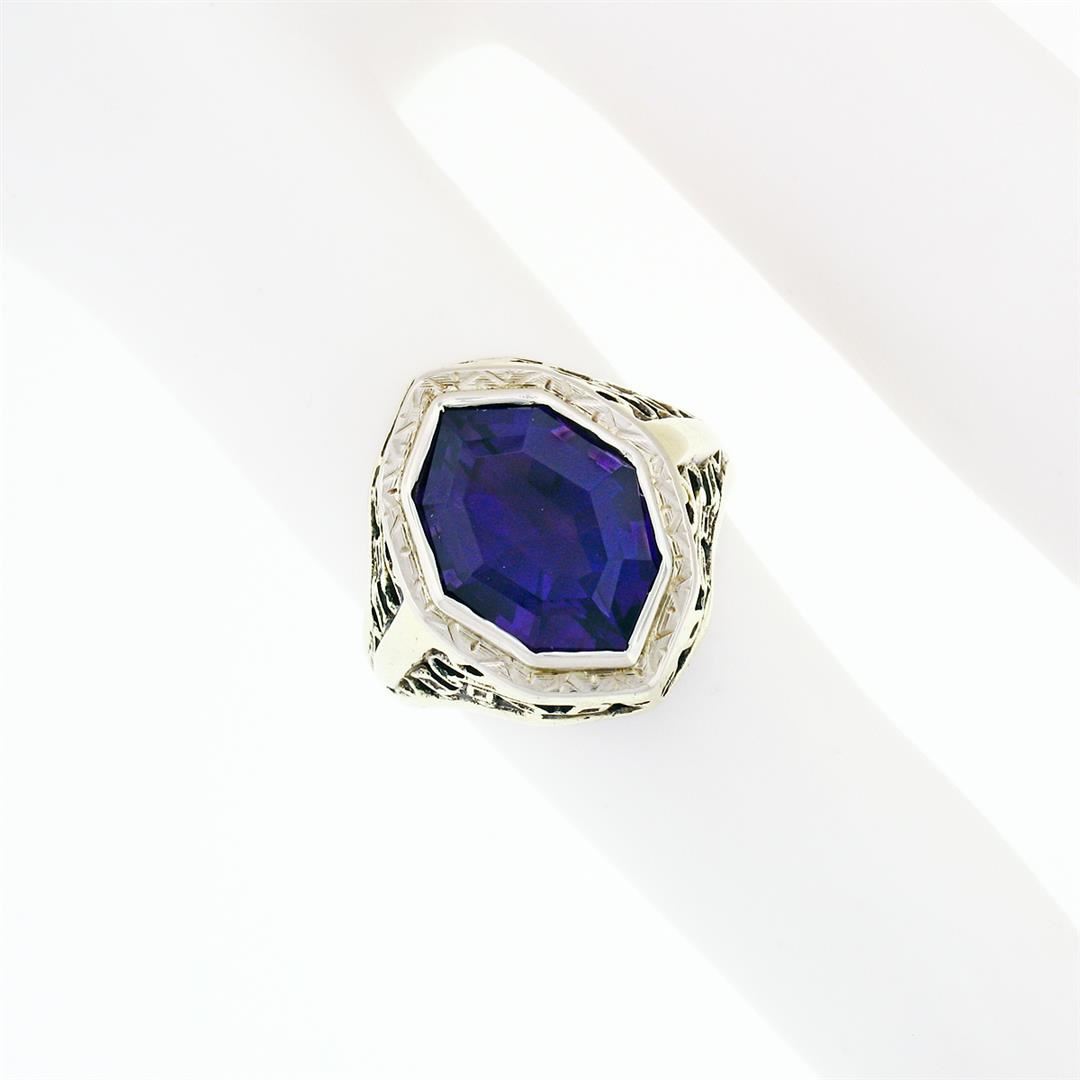 An art deco period solid 14k two tone gold solitaire ring with 1 marquise step cut natural amethyst (2.50ct). The ring is size 3.5, weighs a total of 3.16 grams, and measures 15.66mm wide.