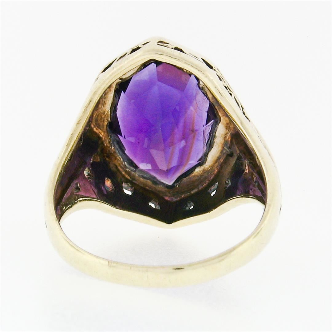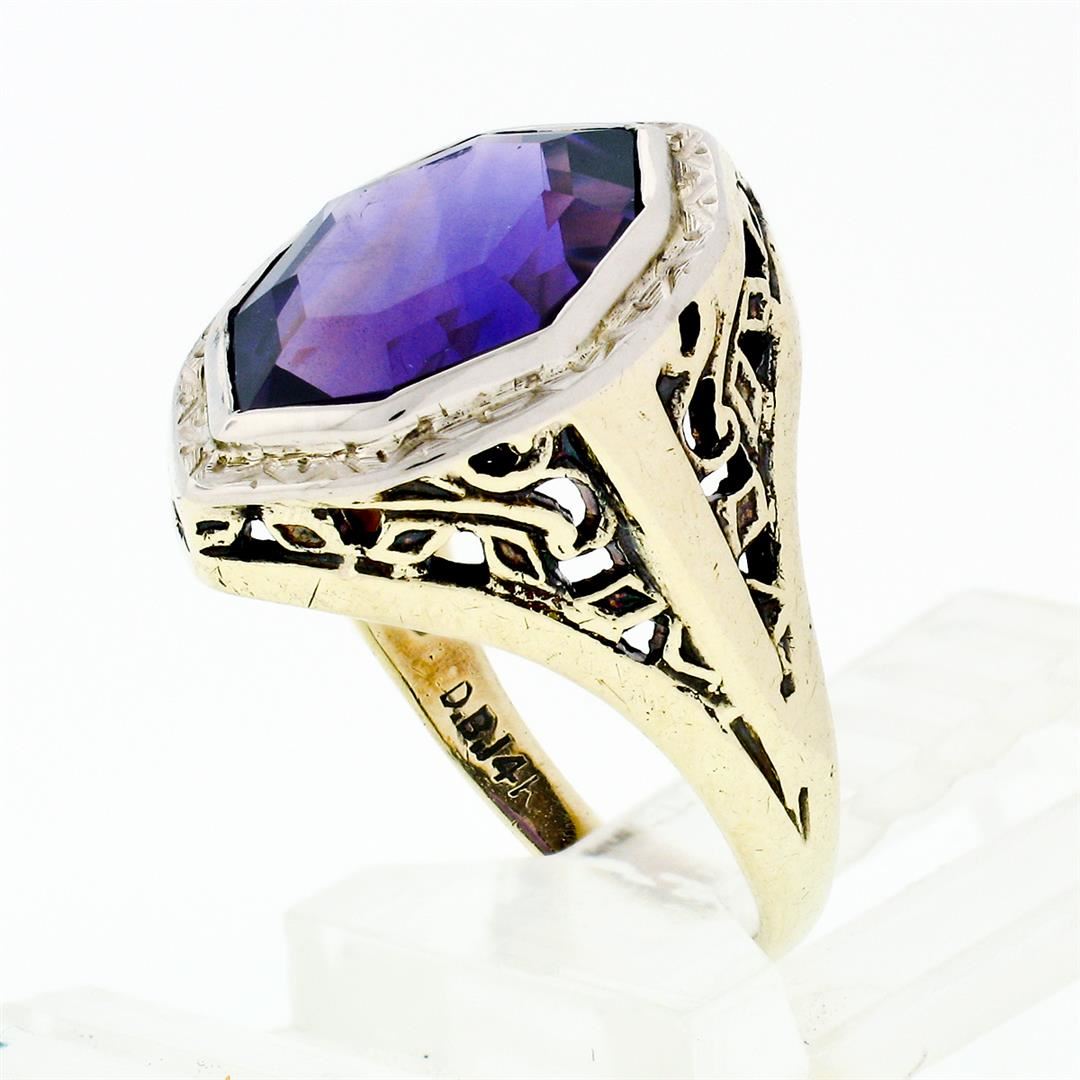 An art deco period solid 14k two tone gold solitaire ring with 1 marquise step cut natural amethyst (2.50ct). The ring is size 3.5, weighs a total of 3.16 grams, and measures 15.66mm wide.