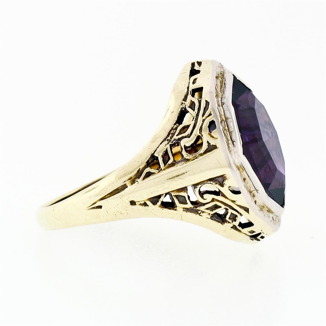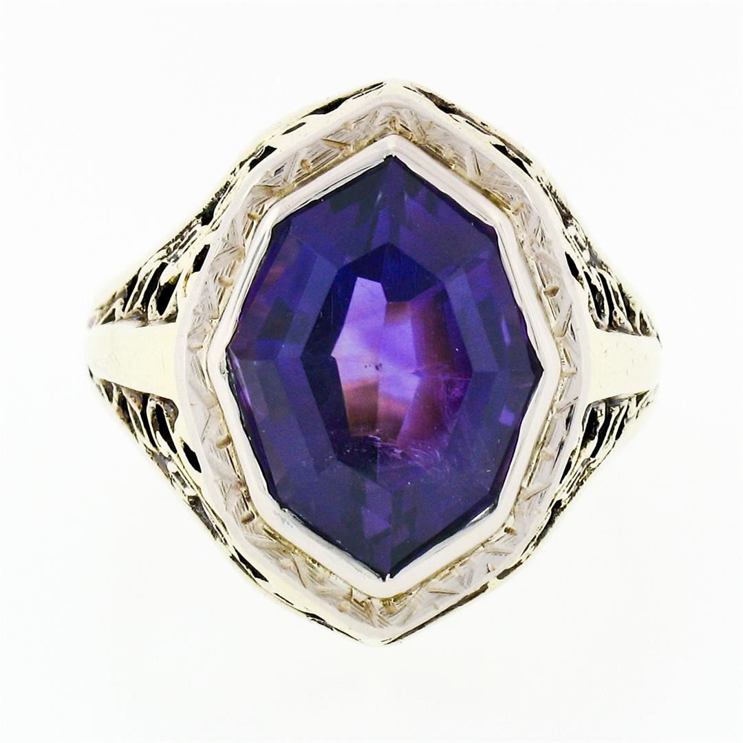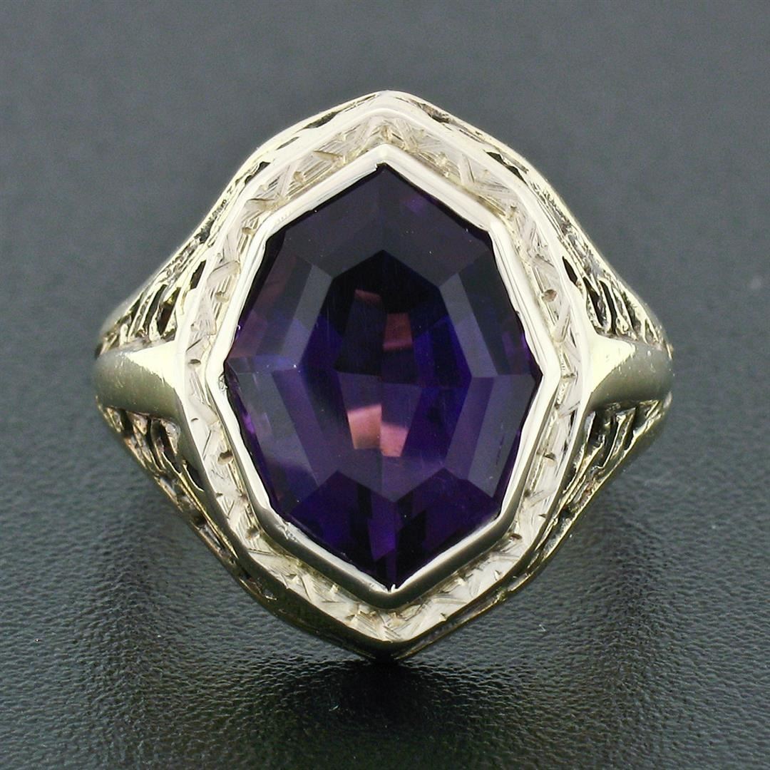An art deco period solid 14k two tone gold solitaire ring with 1 marquise step cut natural amethyst (2.50ct). The ring is size 3.5, weighs a total of 3.16 grams, and measures 15.66mm wide.