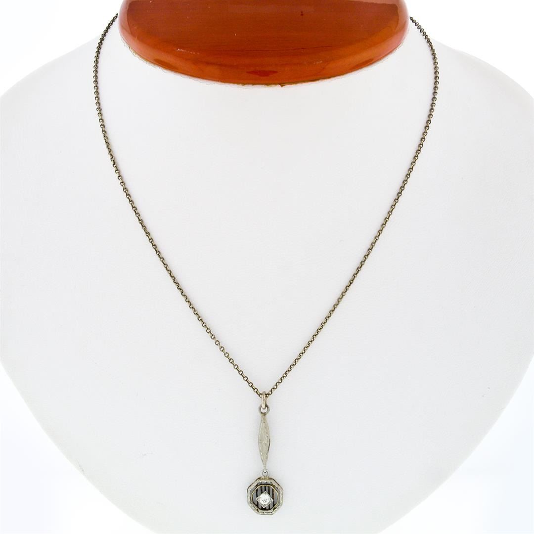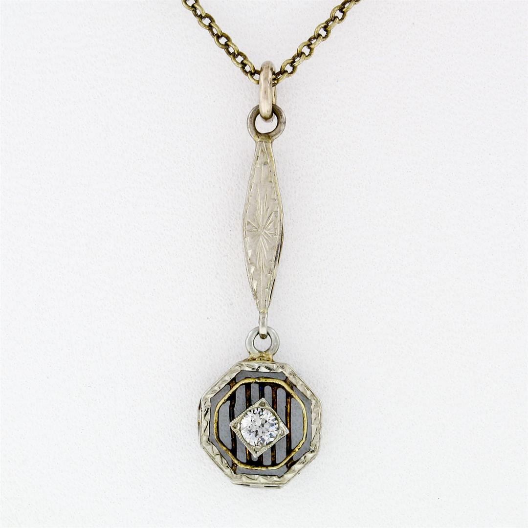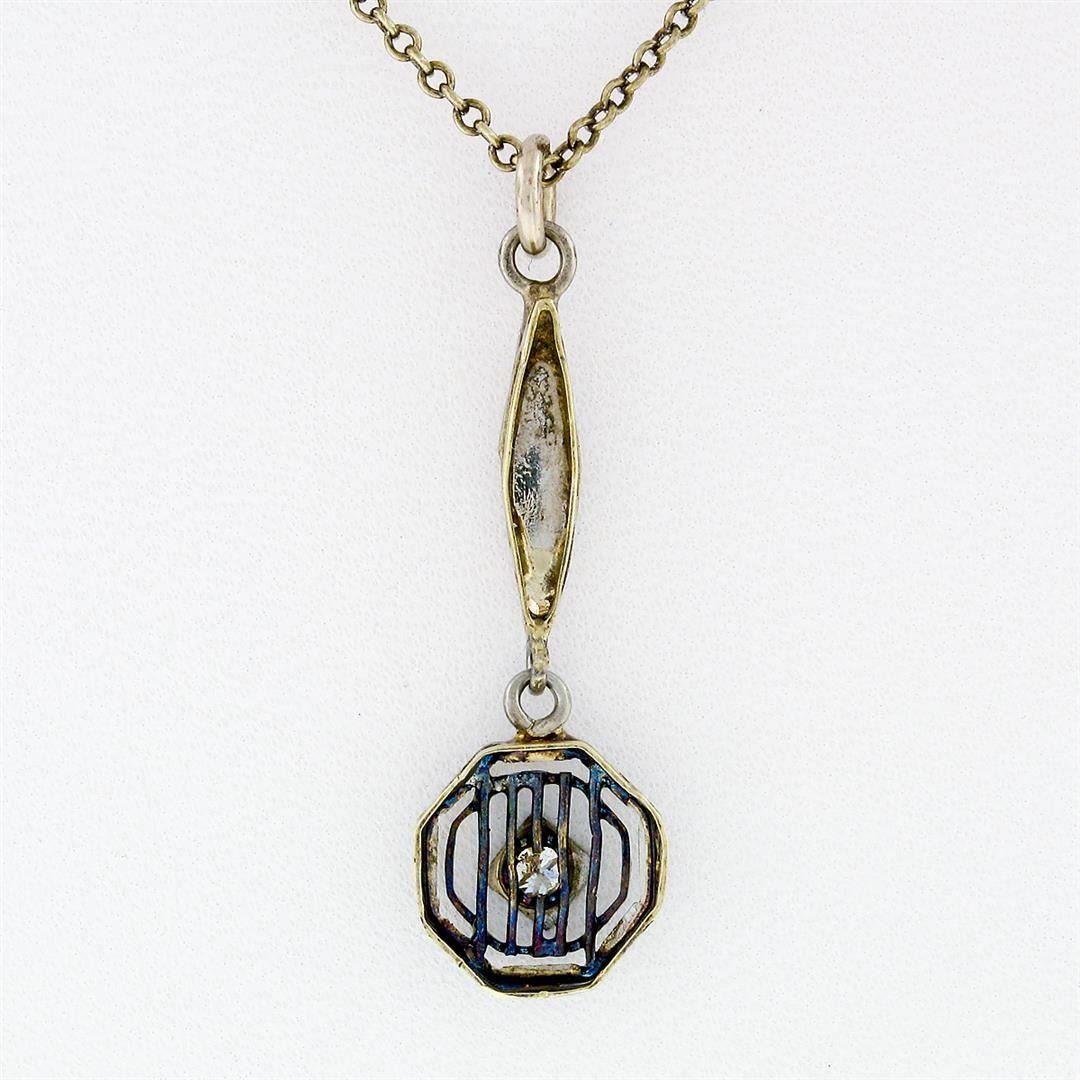 An art deco period solid 14k white and yellow gold drop pendant with 1 old European cut natural diamond (I - VS2; 0.15ct). 17.5 inch fine cable link chain, 3.14 grams total weight, pendant measures 32.42x9.62mm.
