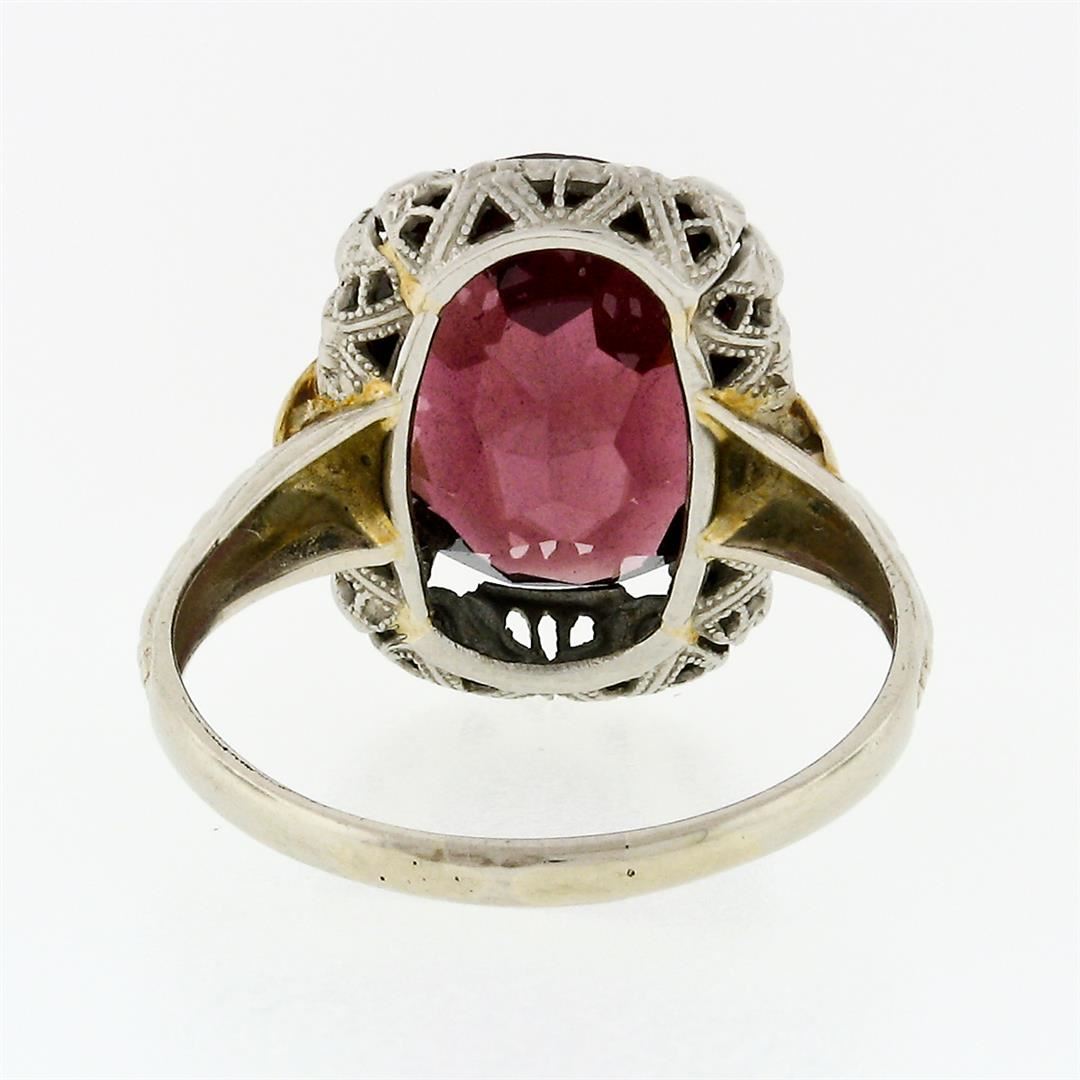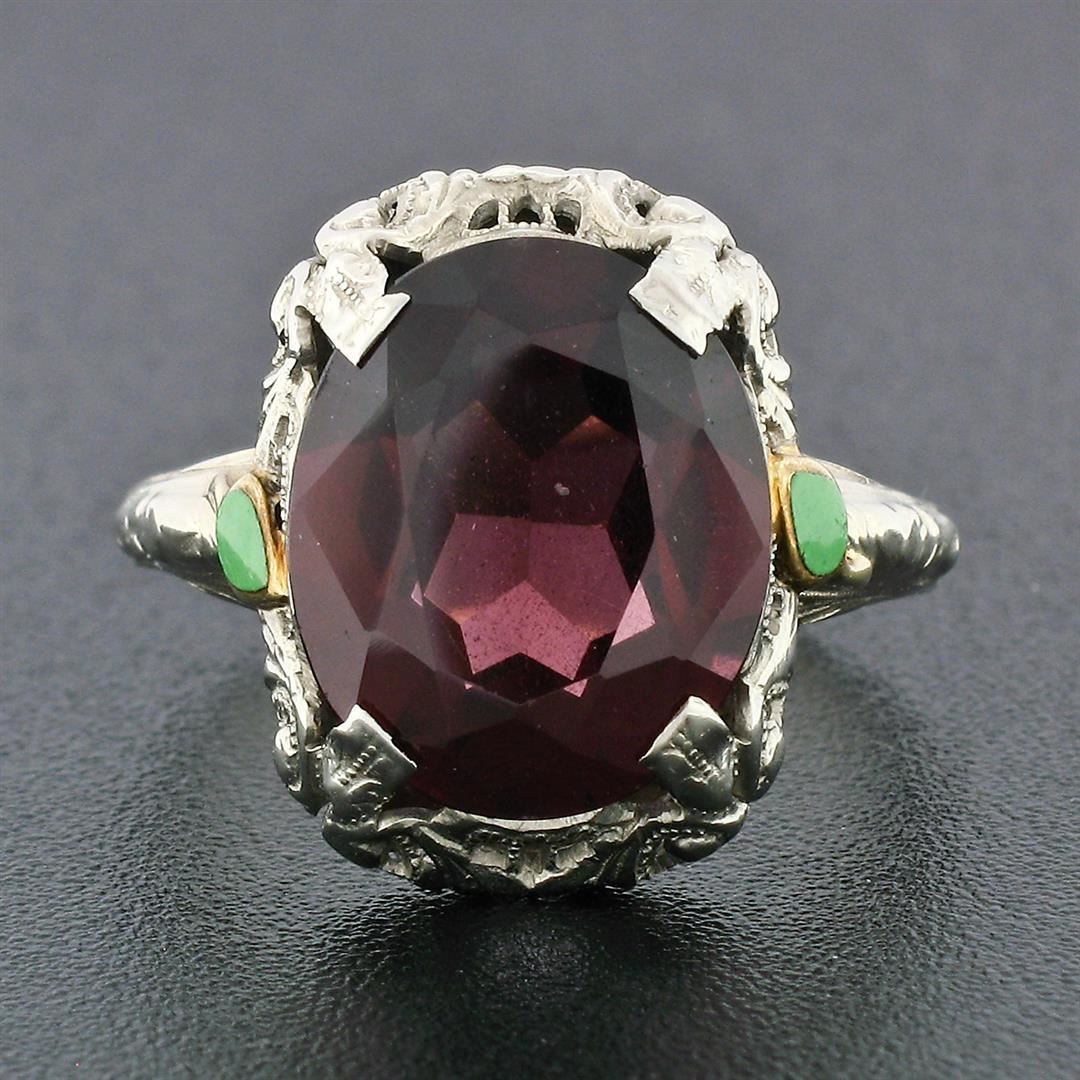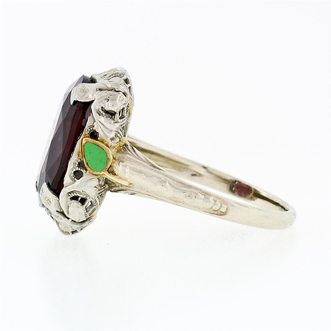 An art deco period solid 14k white gold filigree ring with 1 oval cut natural rhodolite garnet (12.10x10.06mm) and 2 green enamel leaves. The ring is size 6, weighs a total of 2.85 grams, and measures 15.32mm wide.