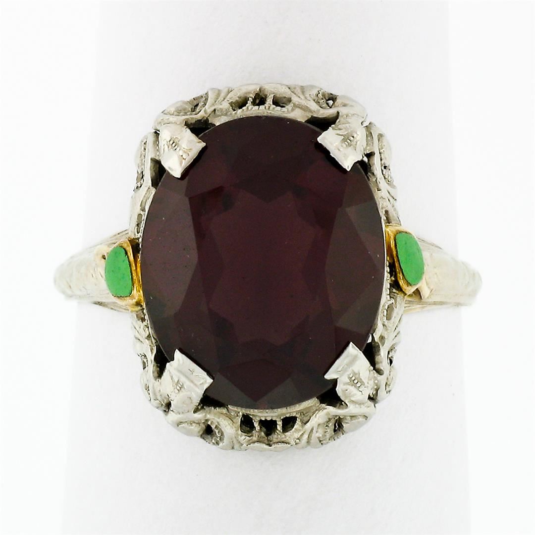 An art deco period solid 14k white gold filigree ring with 1 oval cut natural rhodolite garnet (12.10x10.06mm) and 2 green enamel leaves. The ring is size 6, weighs a total of 2.85 grams, and measures 15.32mm wide.