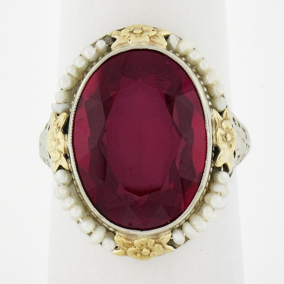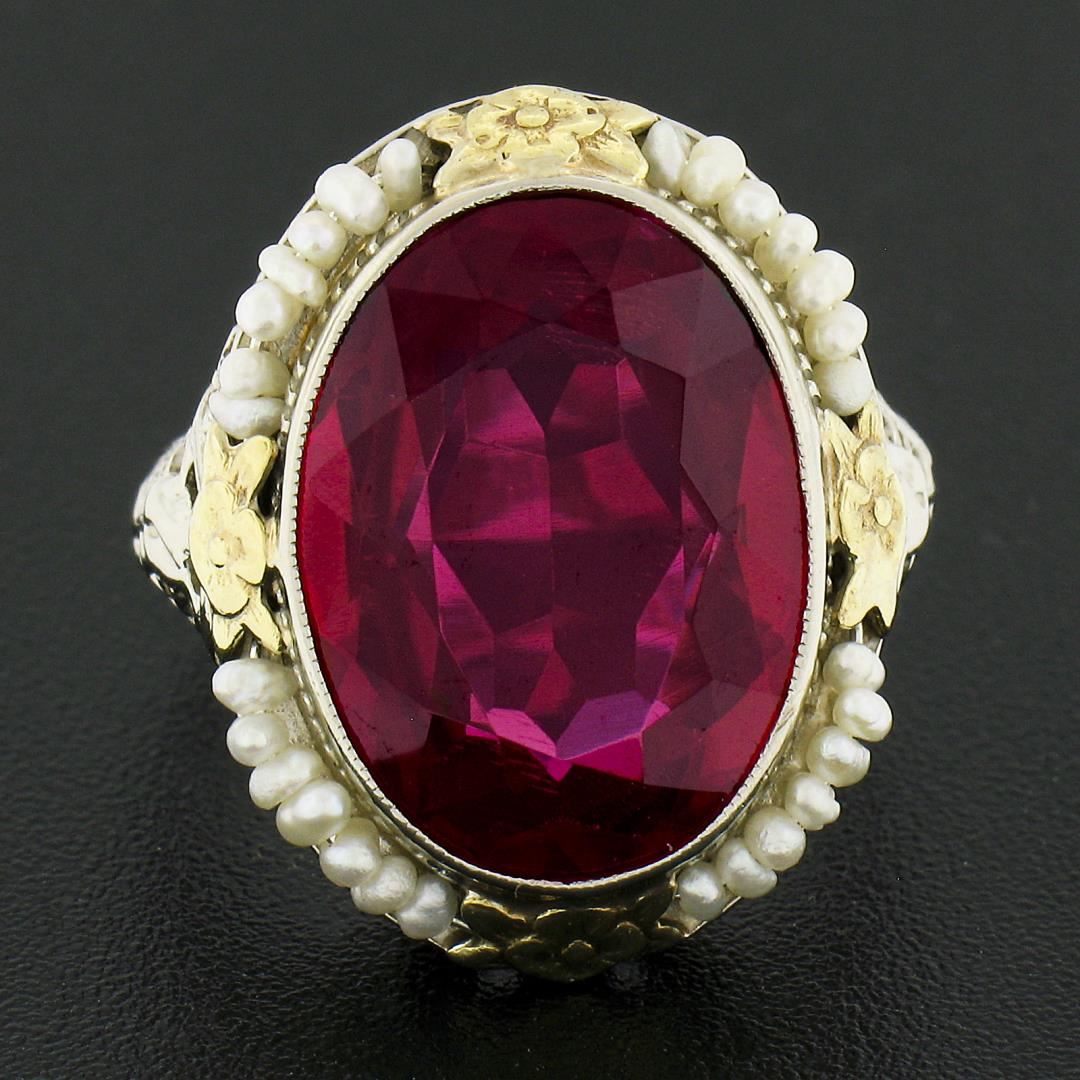 An antqiue solid 14k yellow gold ring, with 1 oval cut synthetic ruby (15.5x11.5mm), and 28 cultured seed pearls. The ring is size 6.5, weighs a total of 5.5 grams, and measures 20.9mm wide.