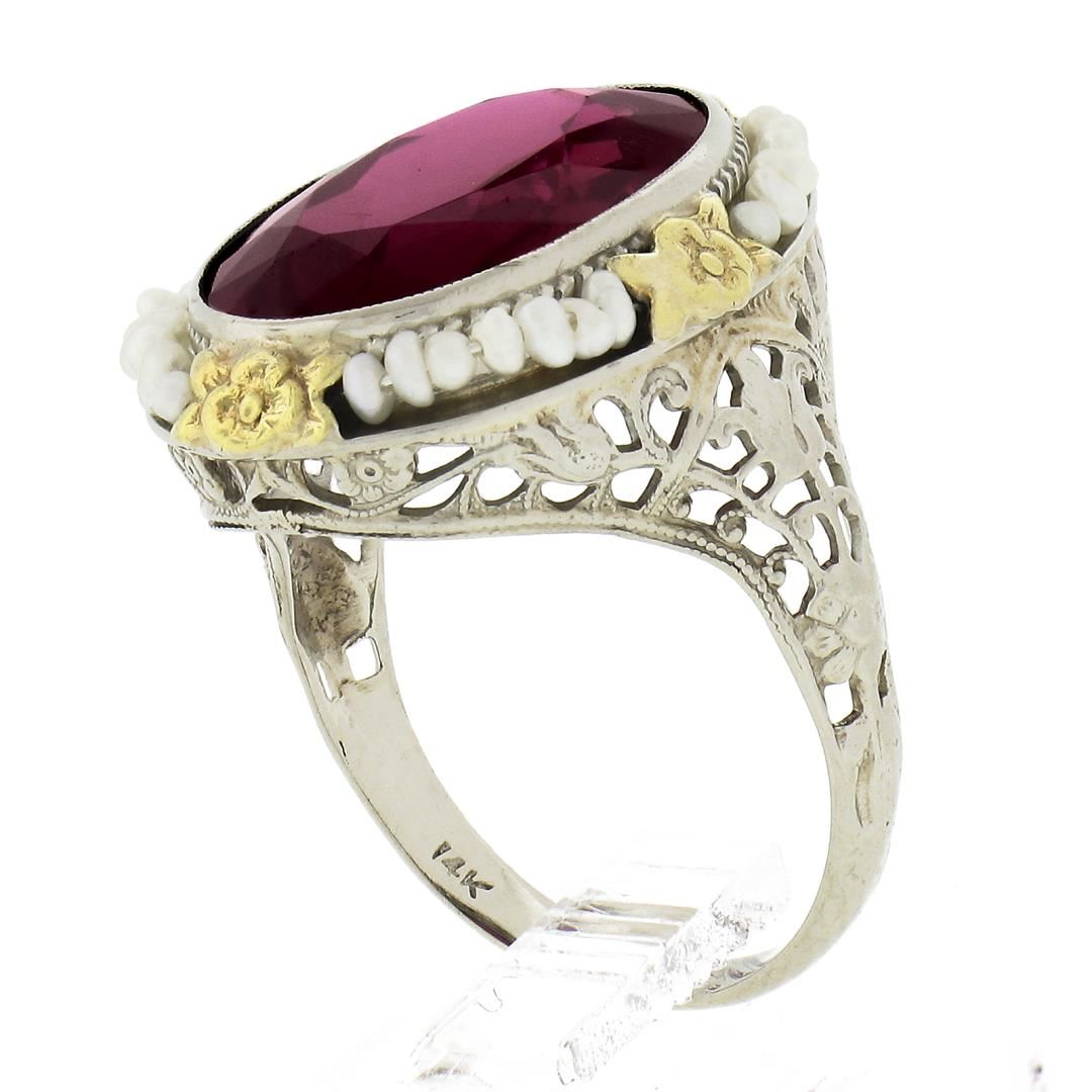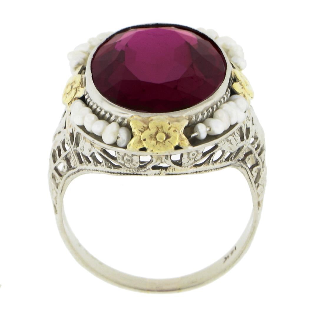 An antqiue solid 14k yellow gold ring, with 1 oval cut synthetic ruby (15.5x11.5mm), and 28 cultured seed pearls. The ring is size 6.5, weighs a total of 5.5 grams, and measures 20.9mm wide.