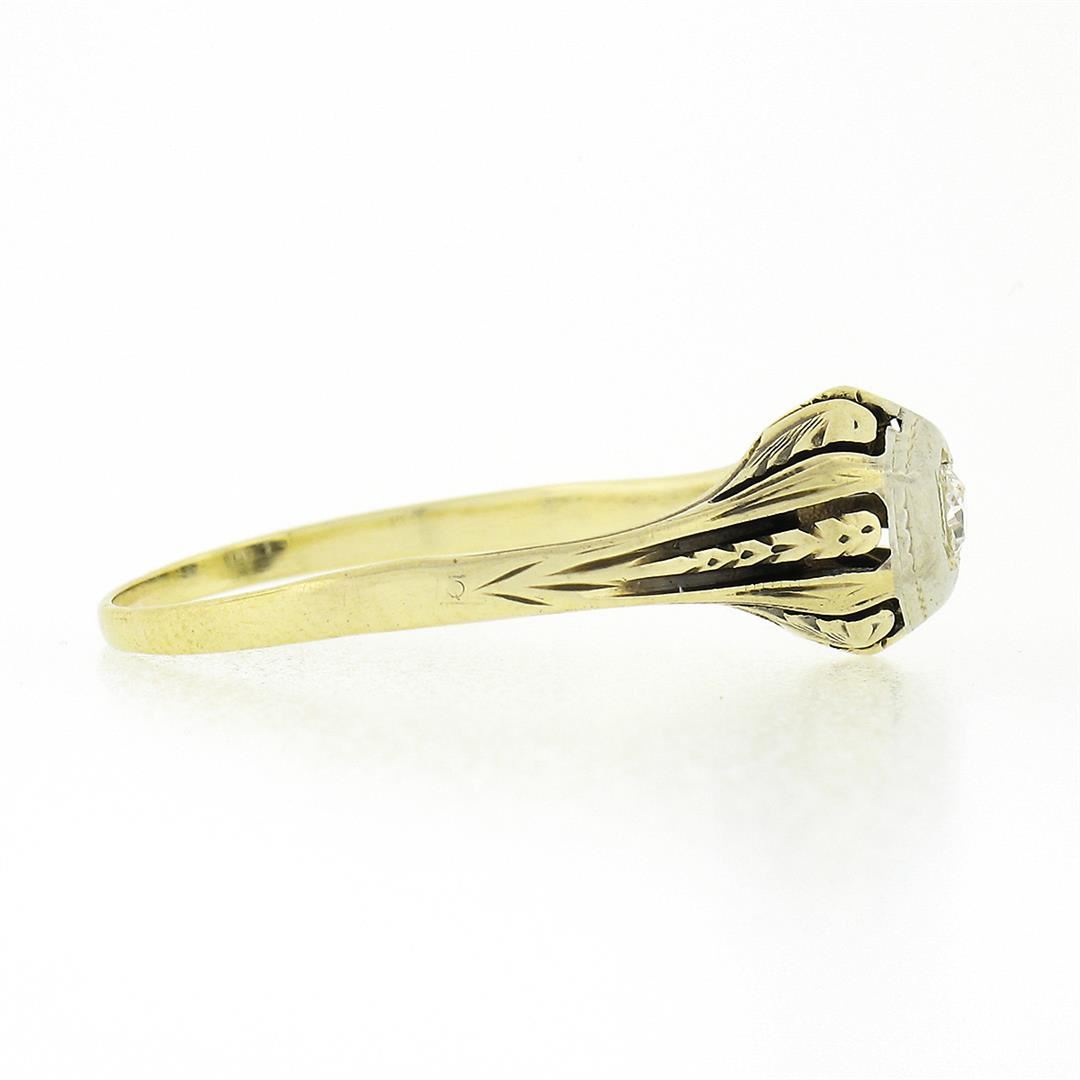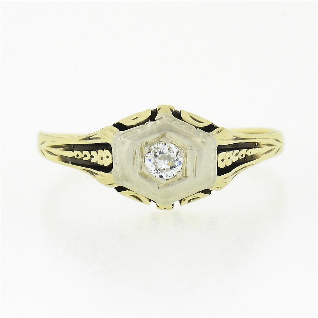 An antique solid 14k yellow and white gold ring, with 1 old european cut natural diamond (H - VS1 ; 0.14ct). The ring is size 7.5, weighs a total of 2.0 grams, and measures 7.65mm wide.
