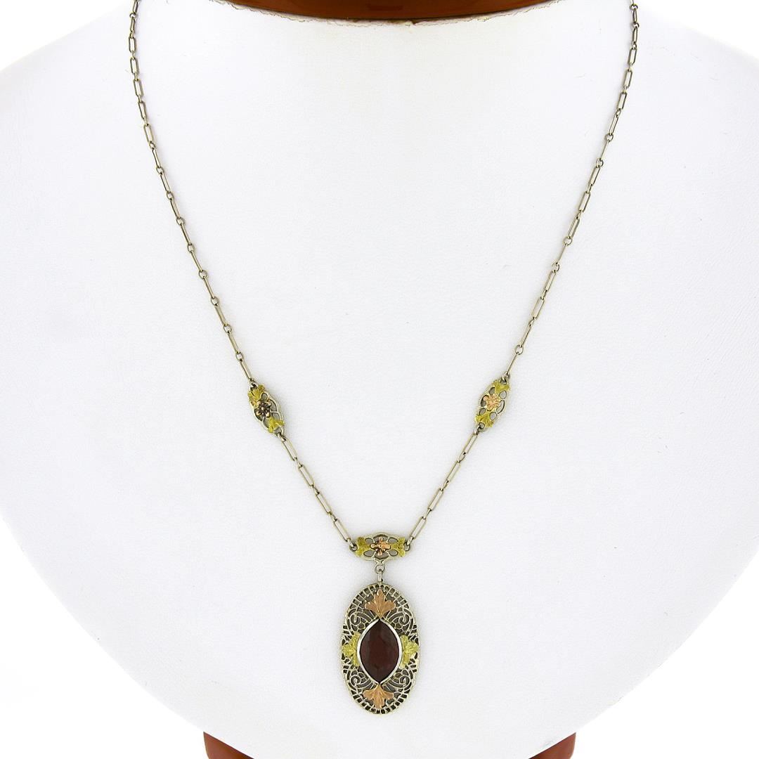 An antique solid 14k green, rose & white gold pendant necklace, featuring 1 marquise cut natural garnet (2.0ct). 15.5 inch oval and round link chain, 3.67 grams total weight, pendant measures 23.8x13.3mm.
