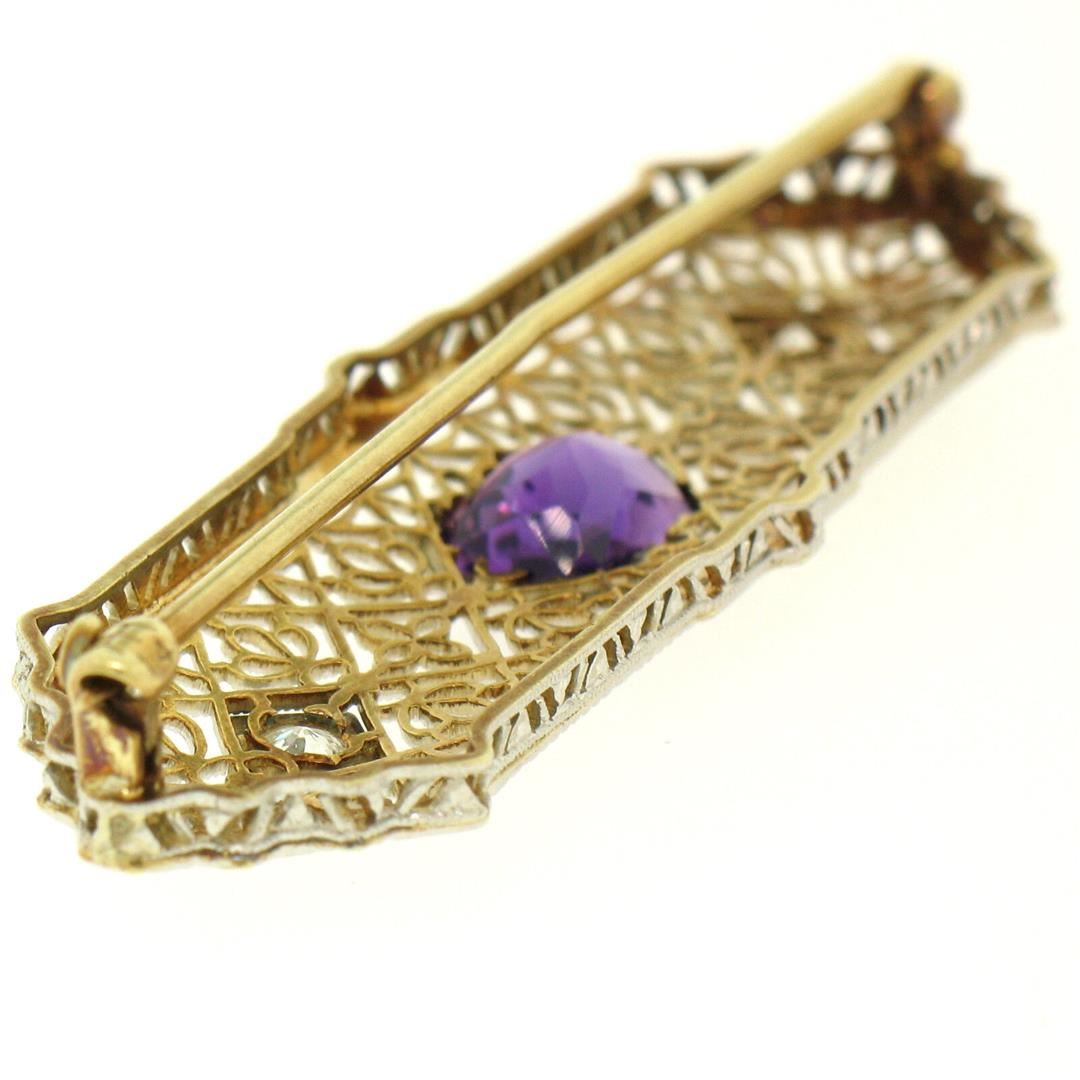 An antique solid 14k yellow and white gold pin brooch, with 1 radiant cut natural amethyst (1.50ct ), and 2 round europeant cut natural diamonds (H - VS1 ; 0.20ctw). Measures 16.32x54.60mm and weighs a total of 5.8 grams.