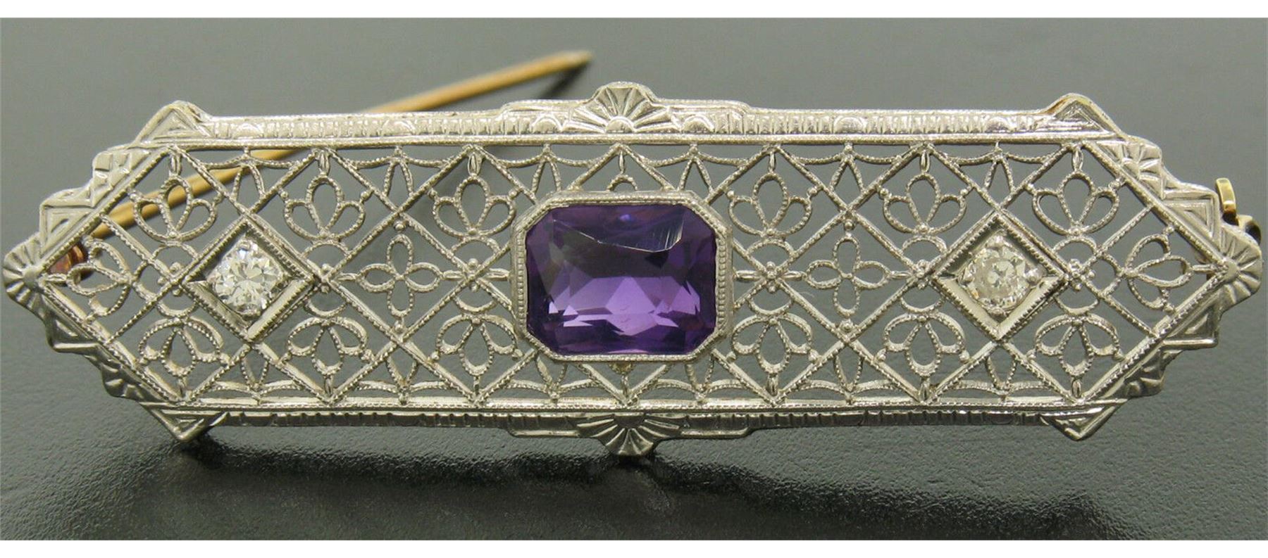An antique solid 14k yellow and white gold pin brooch, with 1 radiant cut natural amethyst (1.50ct ), and 2 round europeant cut natural diamonds (H - VS1 ; 0.20ctw). Measures 16.32x54.60mm and weighs a total of 5.8 grams.
