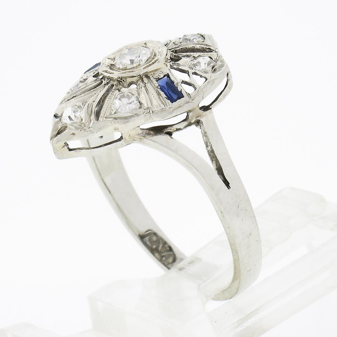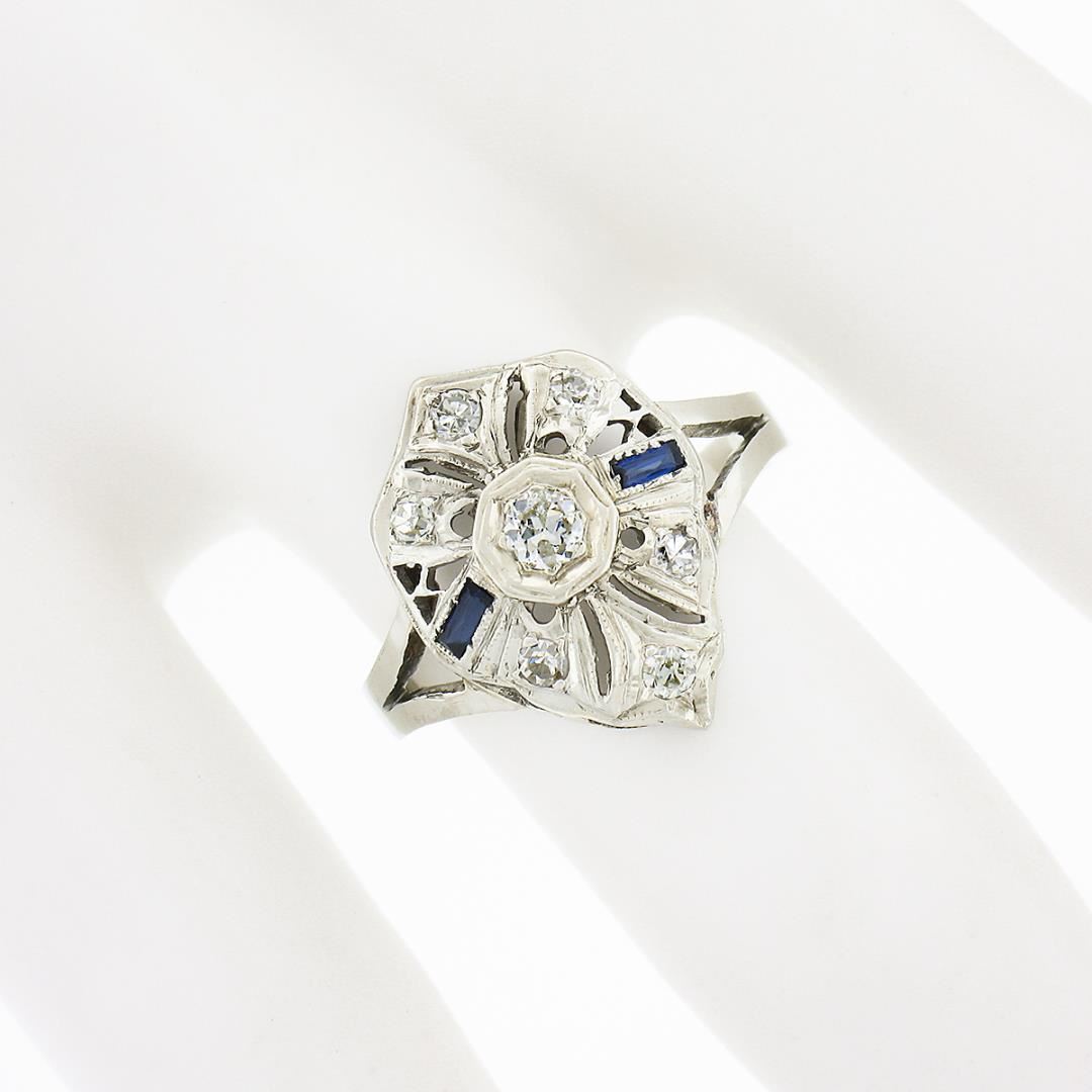 An antique solid 14k white gold ring, with 7 old european & old single cut natural diamonds (G/H - VS2 ; 0.24ctw), and 2 french baguette cut synthetic sapphires ( 0.20ctw). The ring is size 6.0, weighs a total of 2.37 grams, and measures 16.50mm wide.