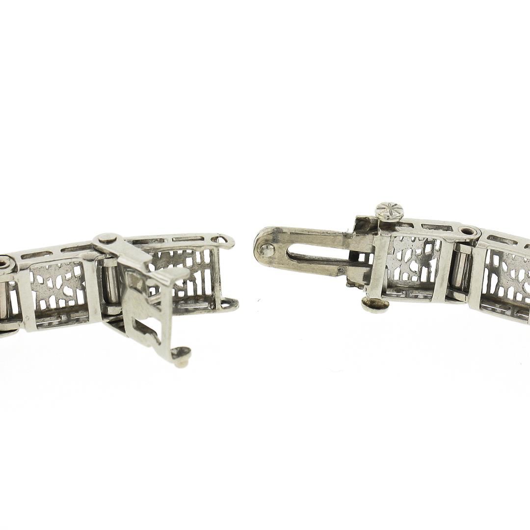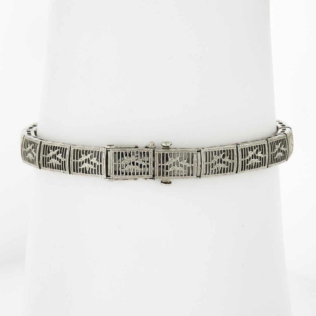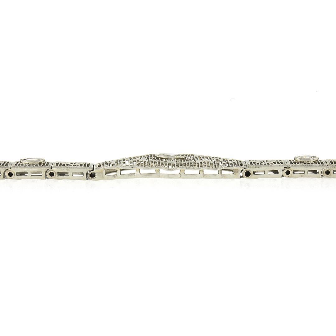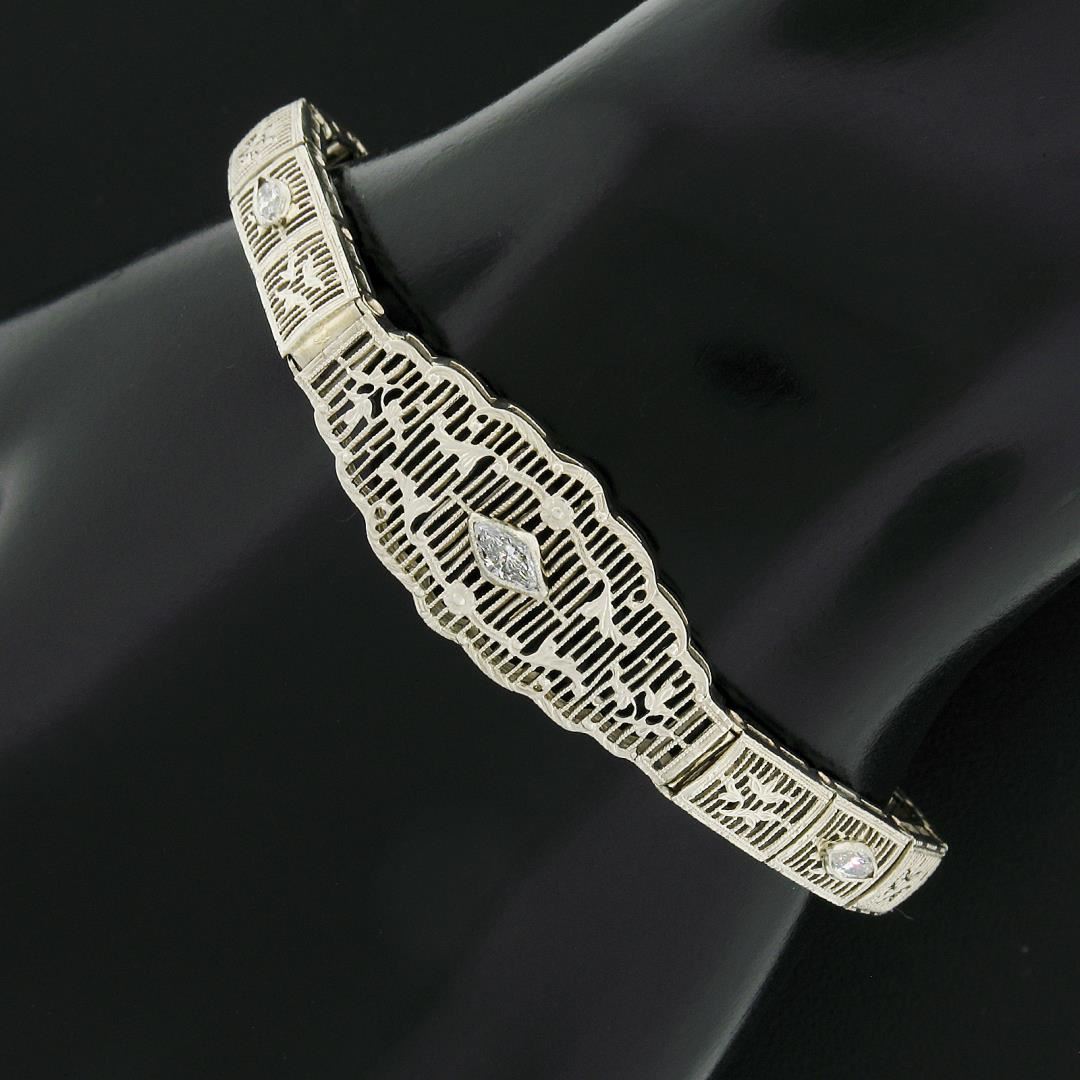 An antique solid 14k white gold belly bracelet, with 3 old marquise cut natrual diamonds (G'/H - SI1-SI2 ; 0.40ctw). It weighs a total of 10.49 grams, measures 13.4mm wide, and measures 6.5 inches in length.