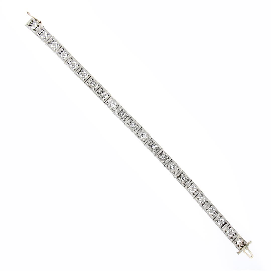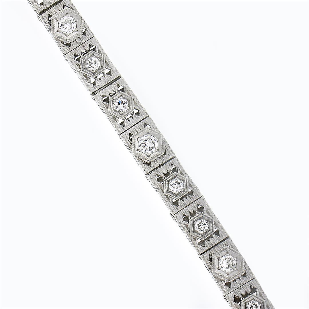 An antique solid 14k white gold line bracelet, with 10 old European cut natural diamonds (G/H - VS1/VS2 ; 0.80ctw). It weighs a total of 12.82 grams, measures 6.20mm wide, and measures 6.5 inches in length.