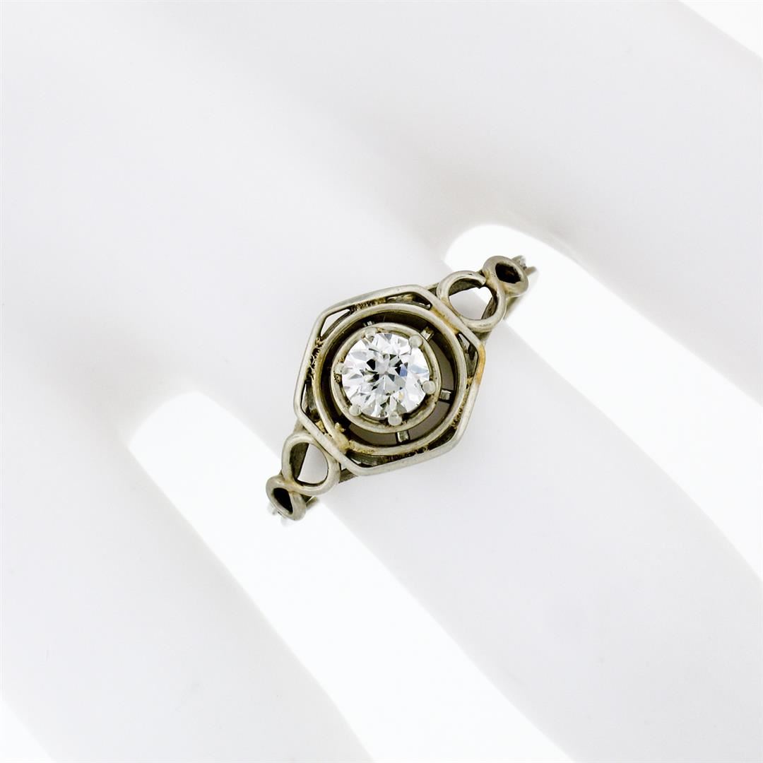 An art deco solid 14k white gold solitaire ring, with 1 old european cut natural diamond (F- VS1; 0.35ct). The ring is size 6.5, weighs a total of 1.7 grams, and measures 9.60mm wide.