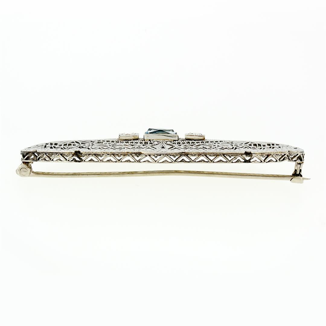 An antique solid 14k white gold pin brooch, with 1 rectangular french cut natural aquamarine (0.47ct ), & 2 old european cut natural diamonds (G- VS2; 0.12ctw). Measures 17.67x54.20mm and weighs a total of 5.25 grams.