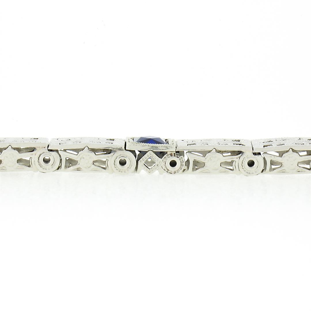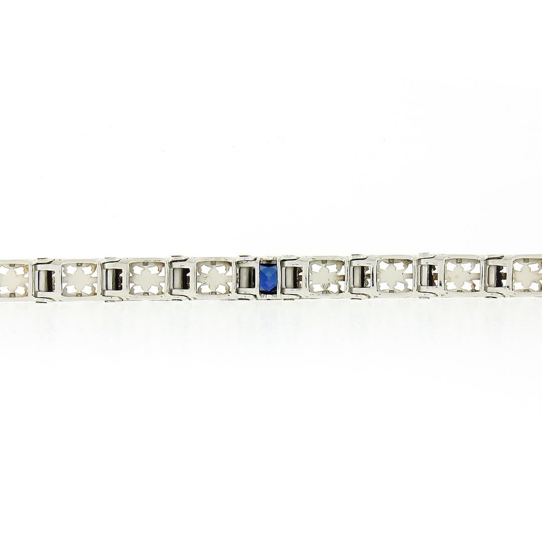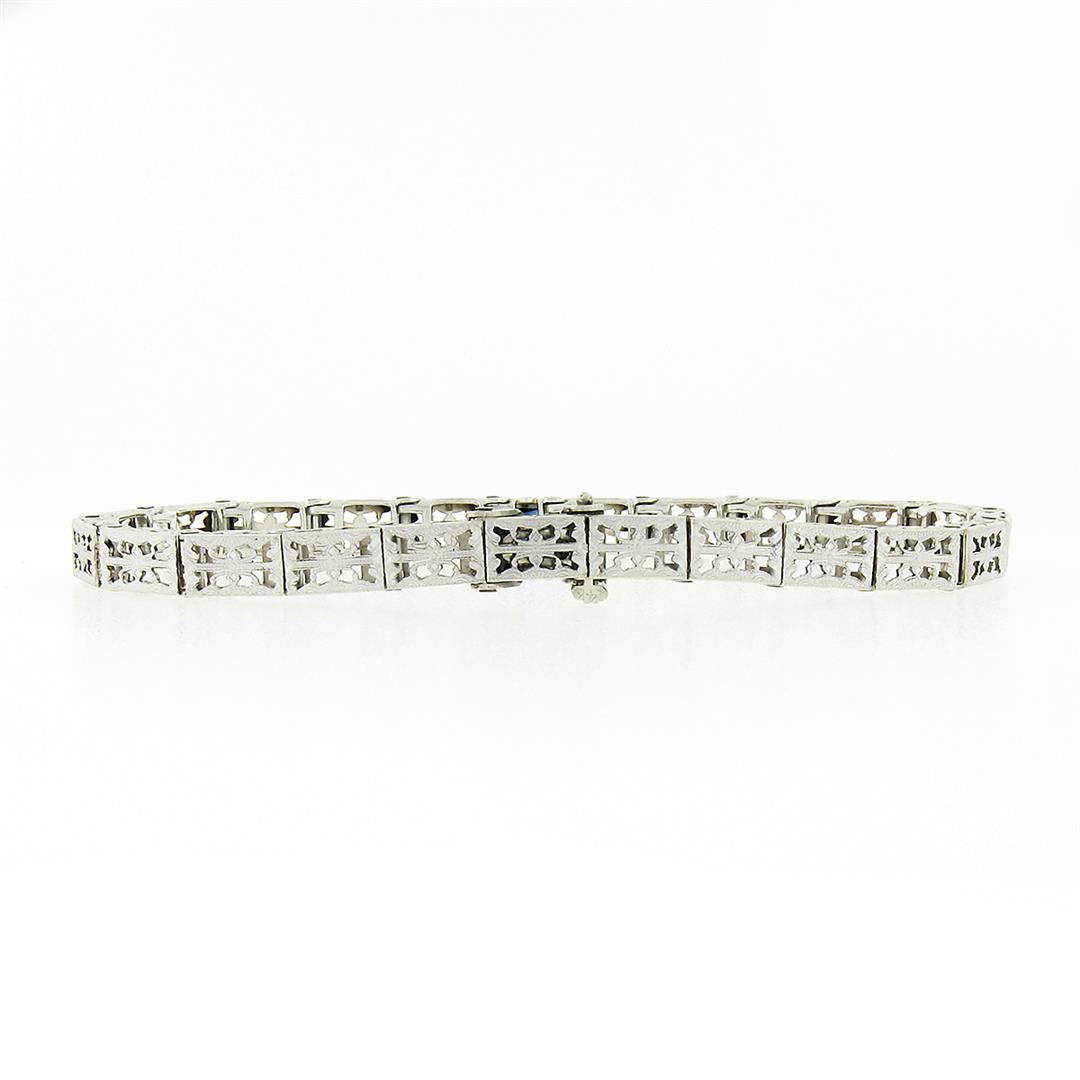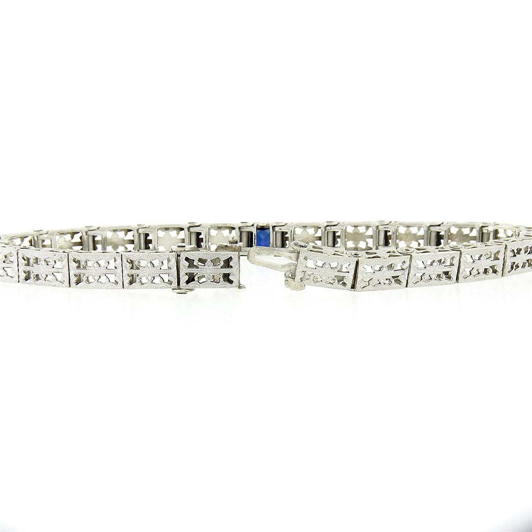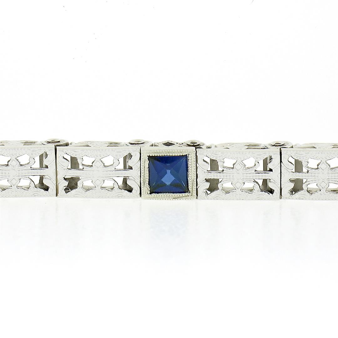 An antique solid 14k white gold link bracelet, with square french cut synthetic sapphire (3.25x3.25mm). It weighs a total of 10.08 grams, measures 5.20mm wide, and measures 6.25 inches in length.