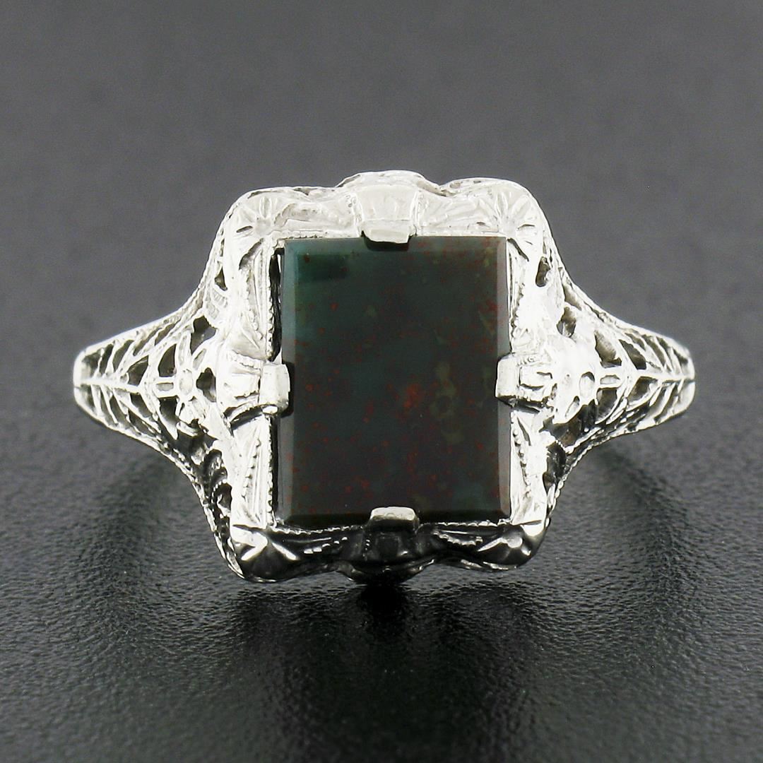 An antique solid 14k white gold ring, with 1 rectangular cut natural bloodstone (8.5x6.55mm). The ring is size 6.0, weighs a total of 1.70 grams, and measures 12.1mm wide.