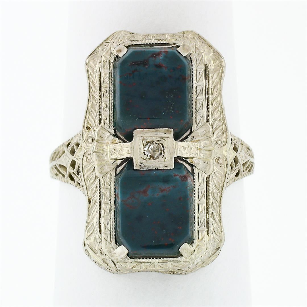 An antique solid 14k white gold filigree ring, with 2 octagonal cut natural bloodstone (8.06x6.86mm), and 1 old european cut natural diamond (J- VS2 ; 0.03ct). The ring is size 6, weighs a total of 3.01 grams, and measures 21.33mm wide.