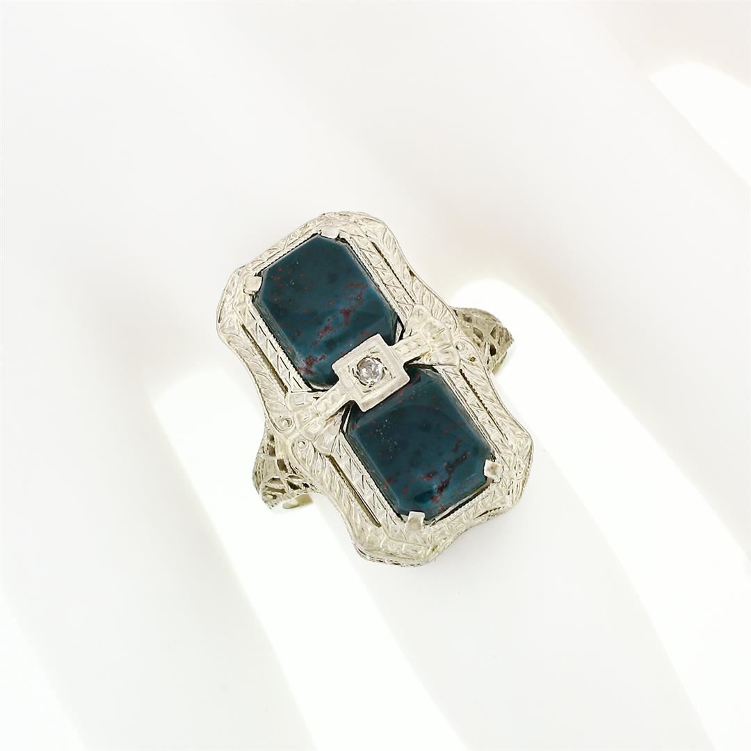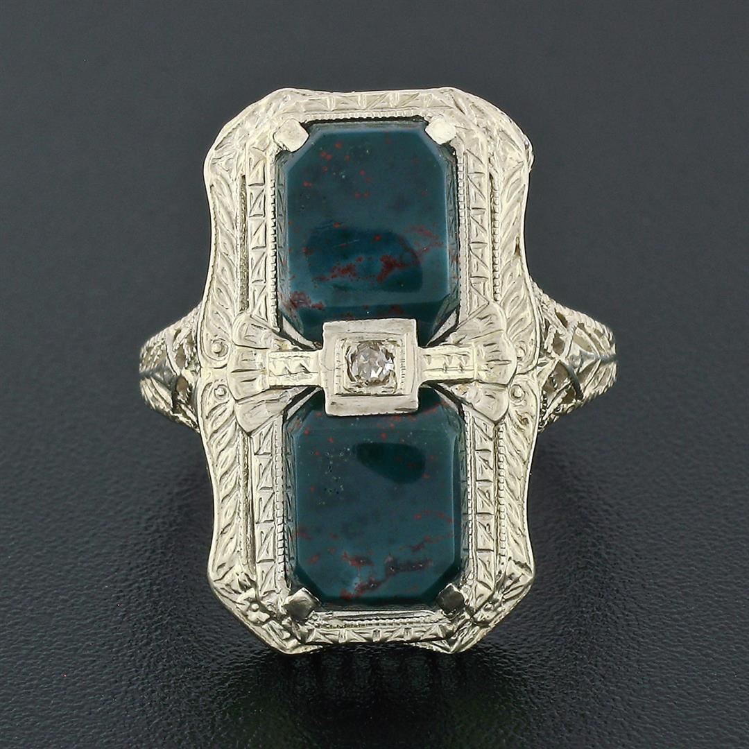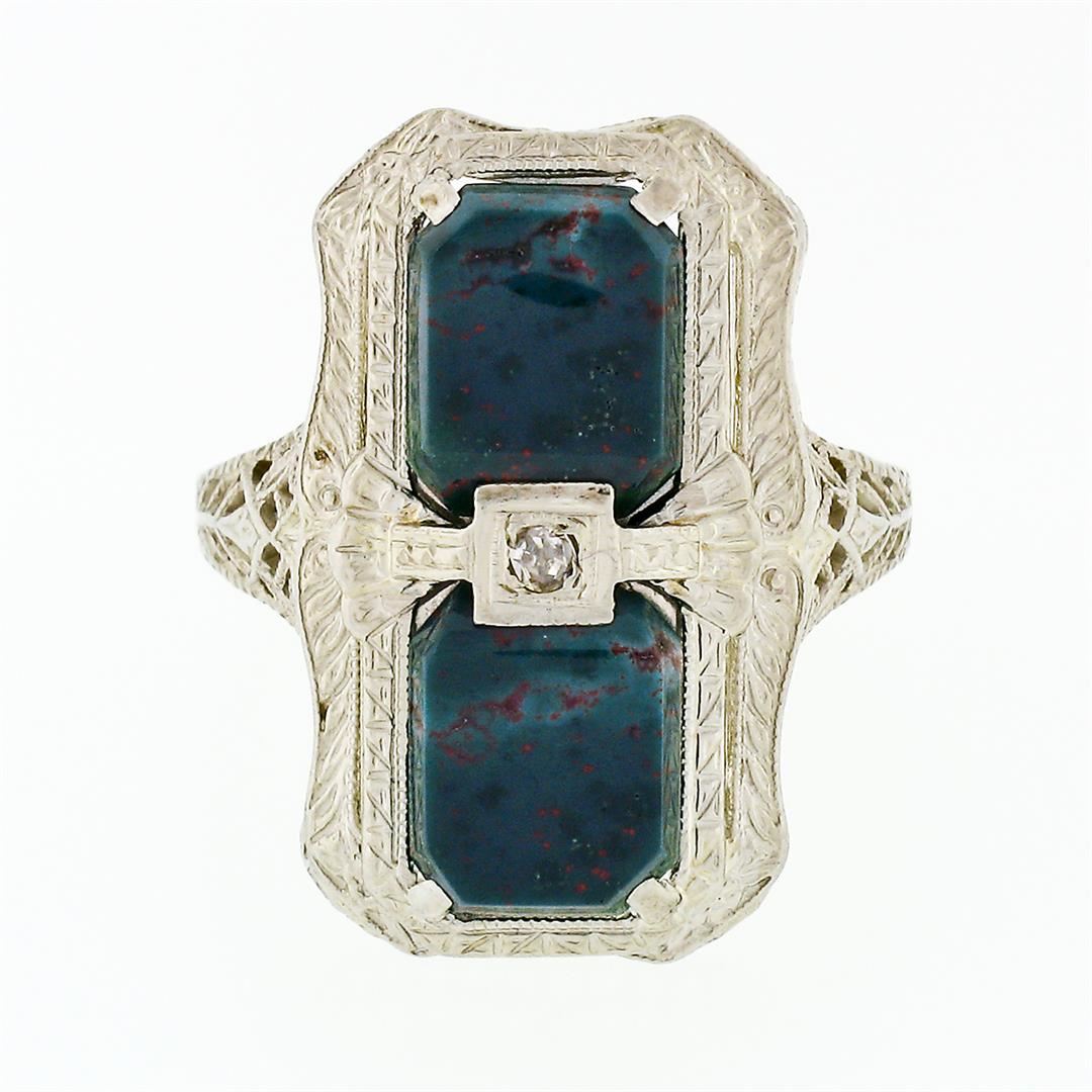 An antique solid 14k white gold filigree ring, with 2 octagonal cut natural bloodstone (8.06x6.86mm), and 1 old european cut natural diamond (J- VS2 ; 0.03ct). The ring is size 6, weighs a total of 3.01 grams, and measures 21.33mm wide.