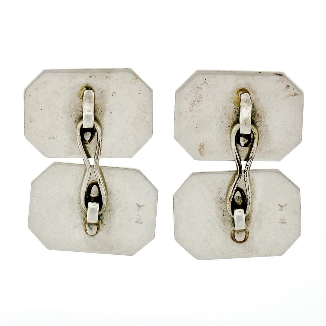 A pair of 14k white gold art deco period cuff links featuring both textured and polished rectangular panels. These cuff links have a dual panel design with a clearance of 14.5mm, weigh a total of 6.89 grams, and the panels measure 16.10x11.75mm.